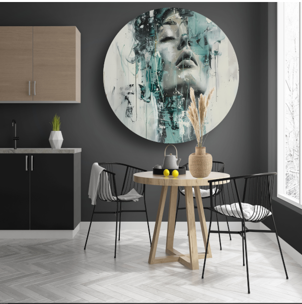 Kies voor dit prachtige dynamische portret van een vrouw in turquoise aluminium muurcirkel en geef je interieur een artistieke touch!