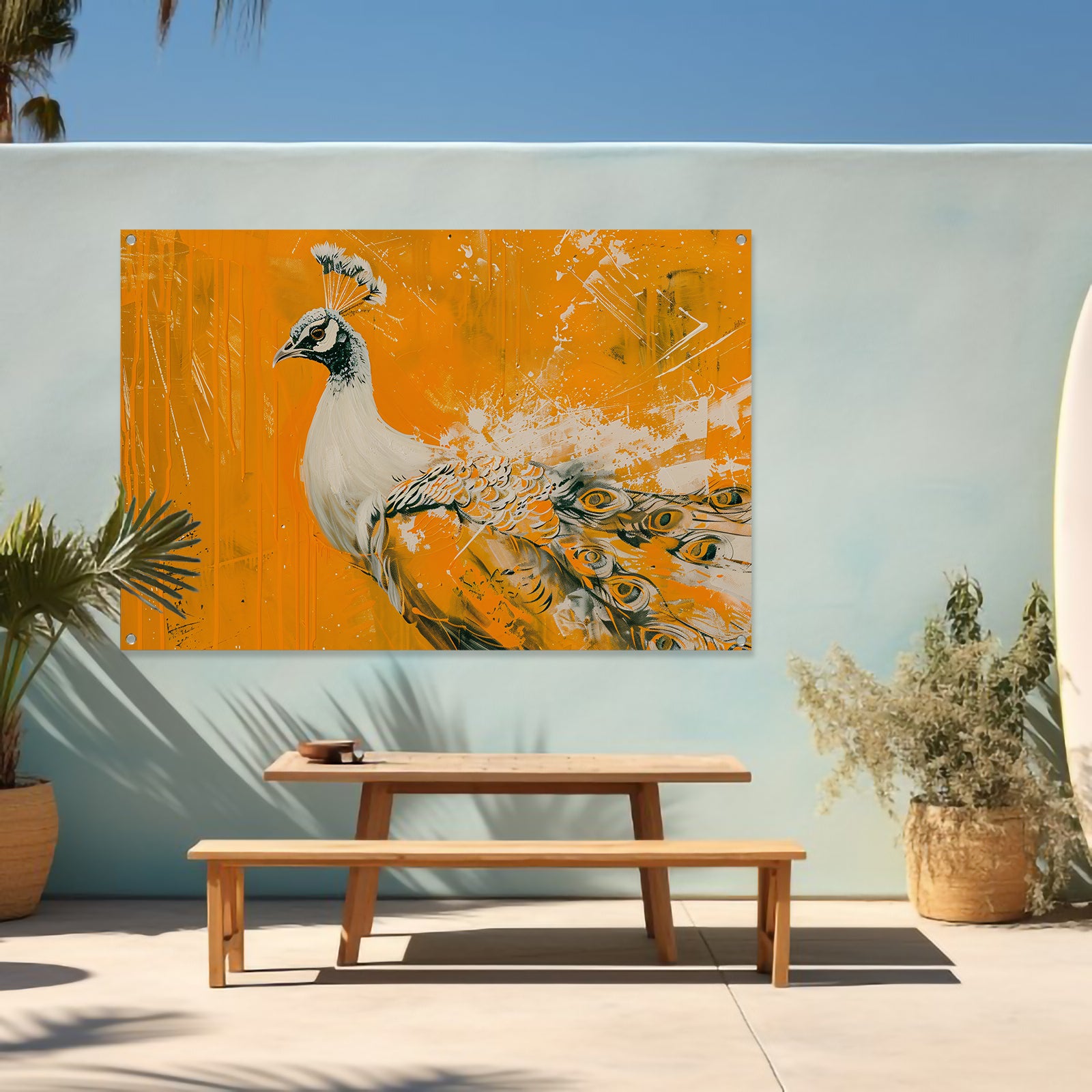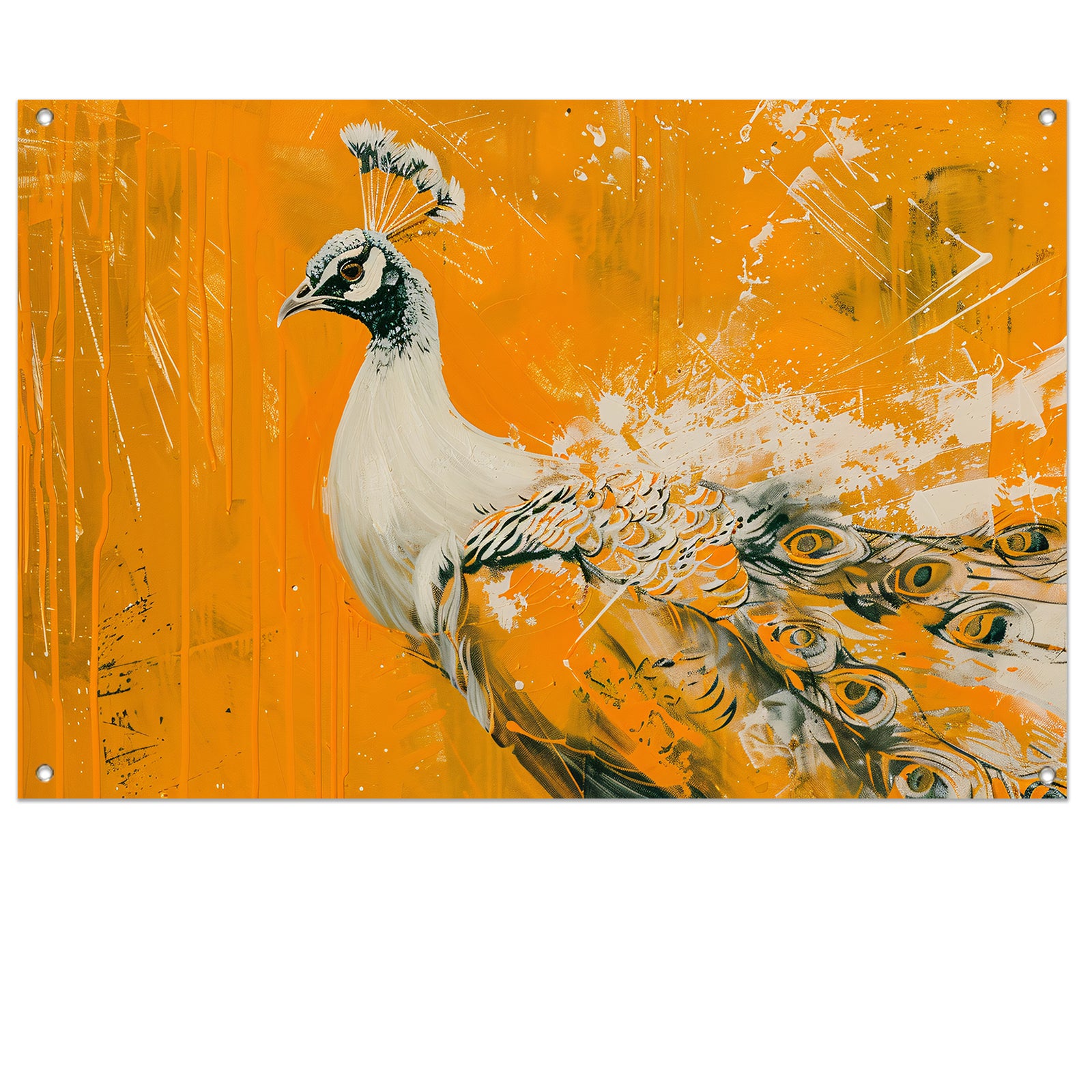 Dynamisch schilderij van een pauw in oranje tuinposter
