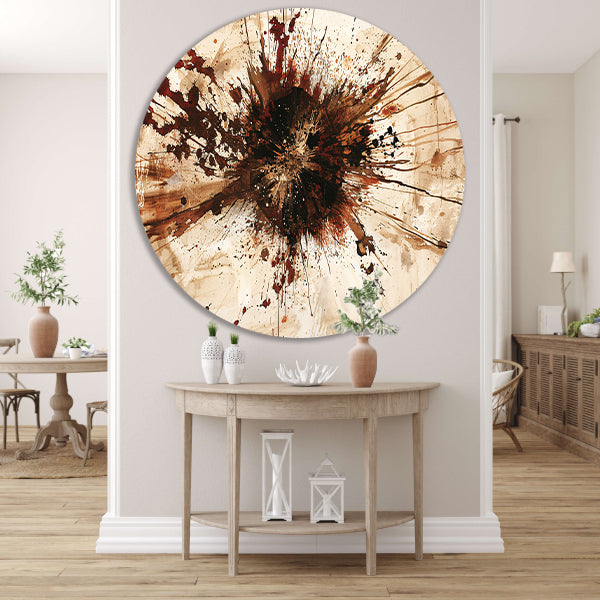 Dynamische abstracte verfexplosie in aardetinten aluminium muurcirkel