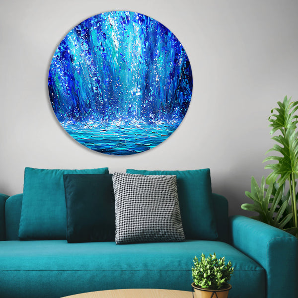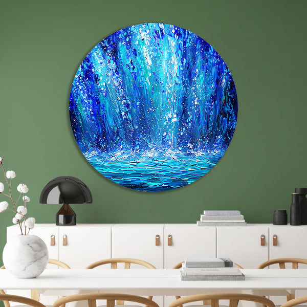 Met zijn abstracte ontwerp en blauwe tinten biedt dit kunstwerk een rustgevende en sfeervolle uitstraling. Haal de natuurlijke schoonheid van een waterval in huis met deze prachtige muurcirkel. Een perfecte aanvulling voor elke ruimte!