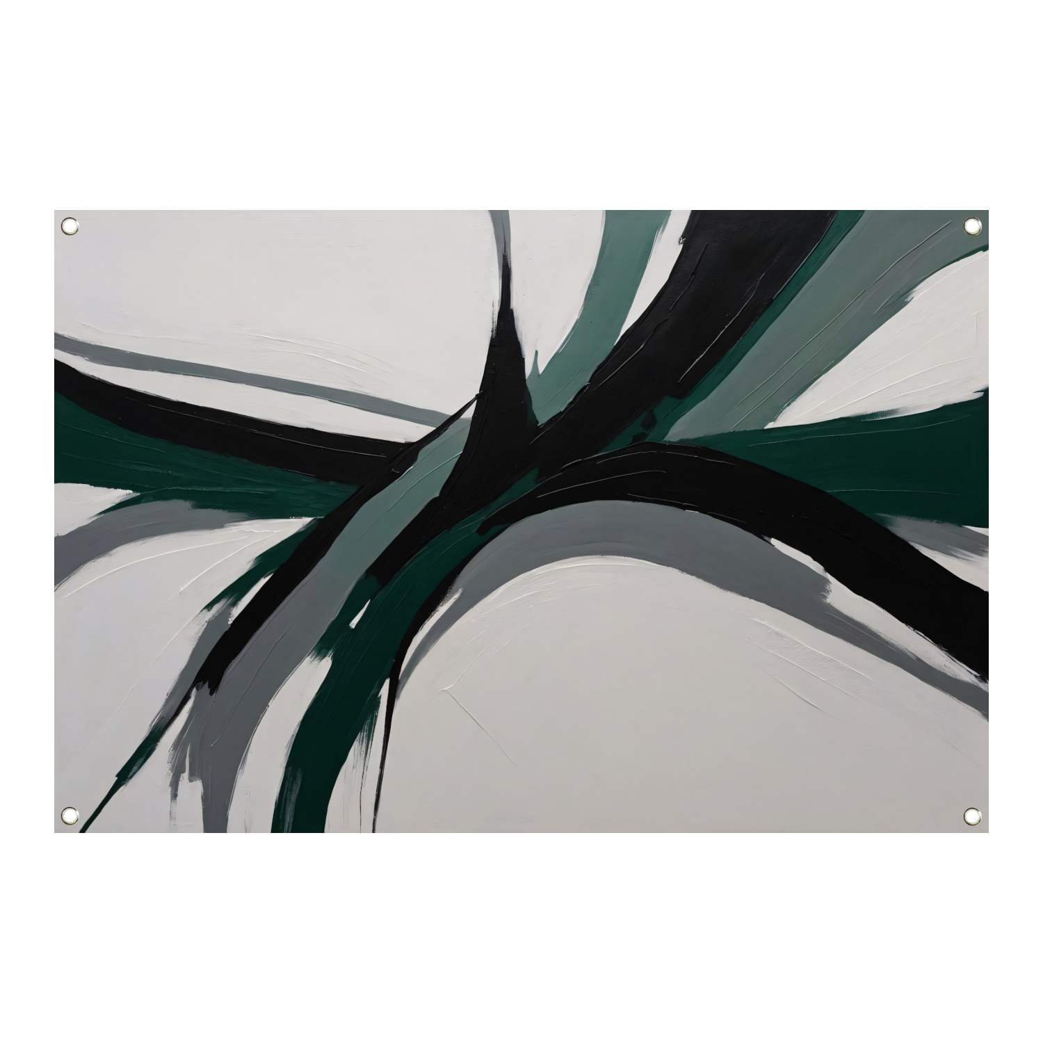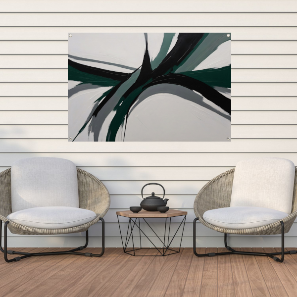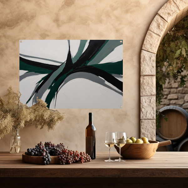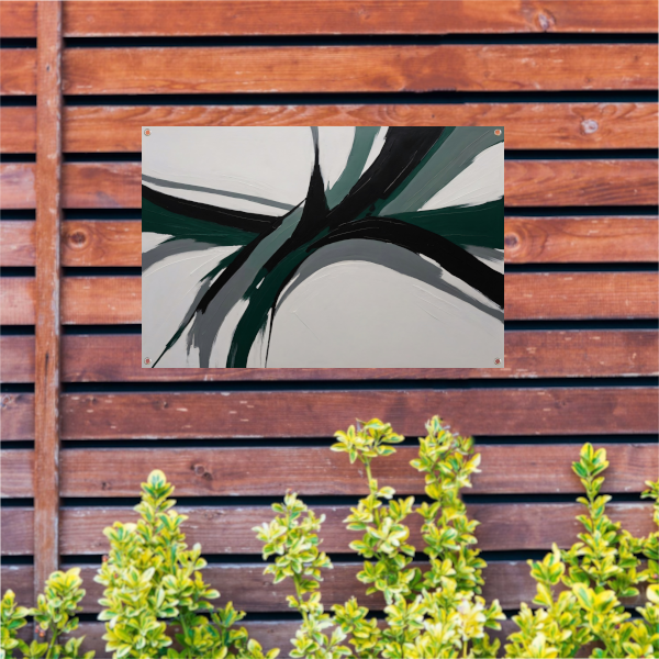 Het thema van deze tuinposter is abstractie, wat zorgt voor een unieke en artistieke sfeer in jouw buitenruimte. De kleuren groen en zwart zijn perfect met elkaar gecombineerd en zorgen voor een rustgevend en harmonieus geheel.