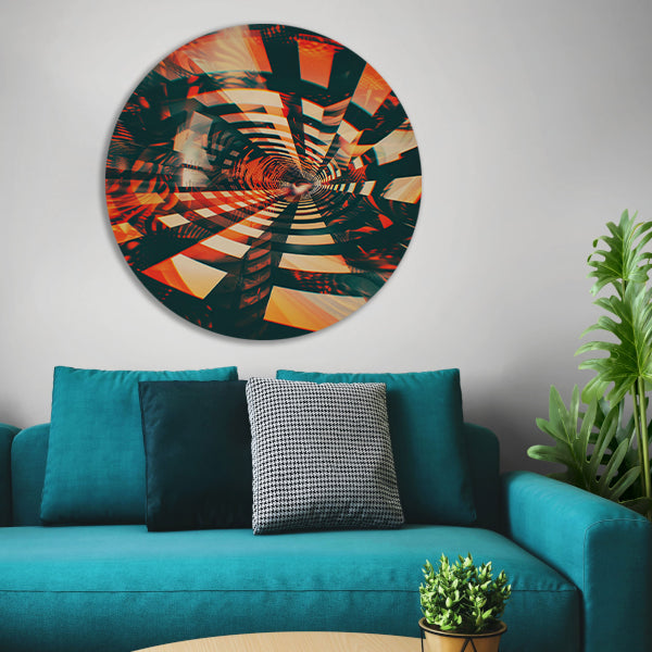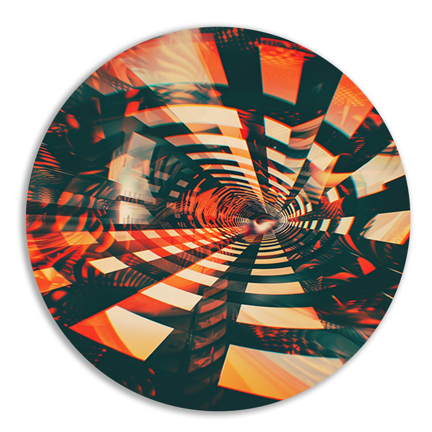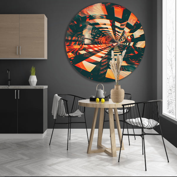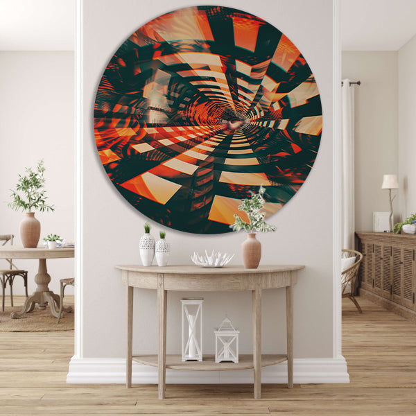De levendige kleuren en de abstracte vormen van de tunnel geven een dynamisch en energiek gevoel aan de ruimte. De muurcirkel is verkrijgbaar in allerlei formaten, waardoor er altijd een passend exemplaar is voor jouw interieur.
