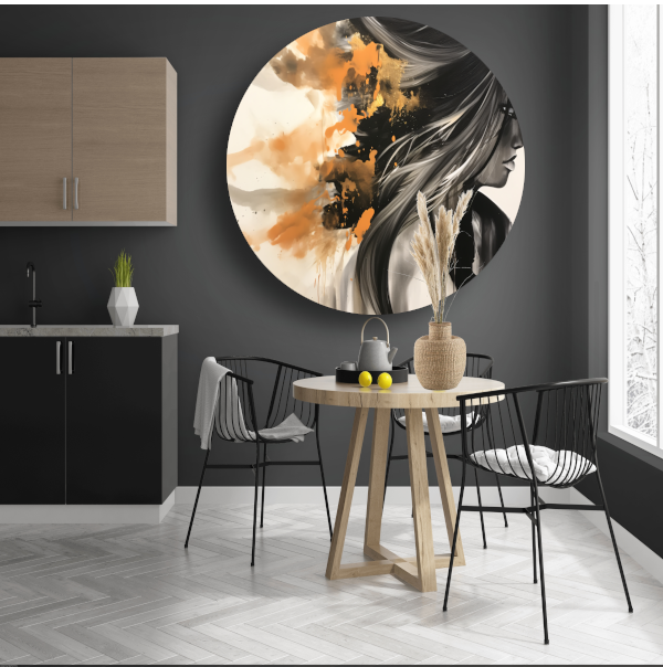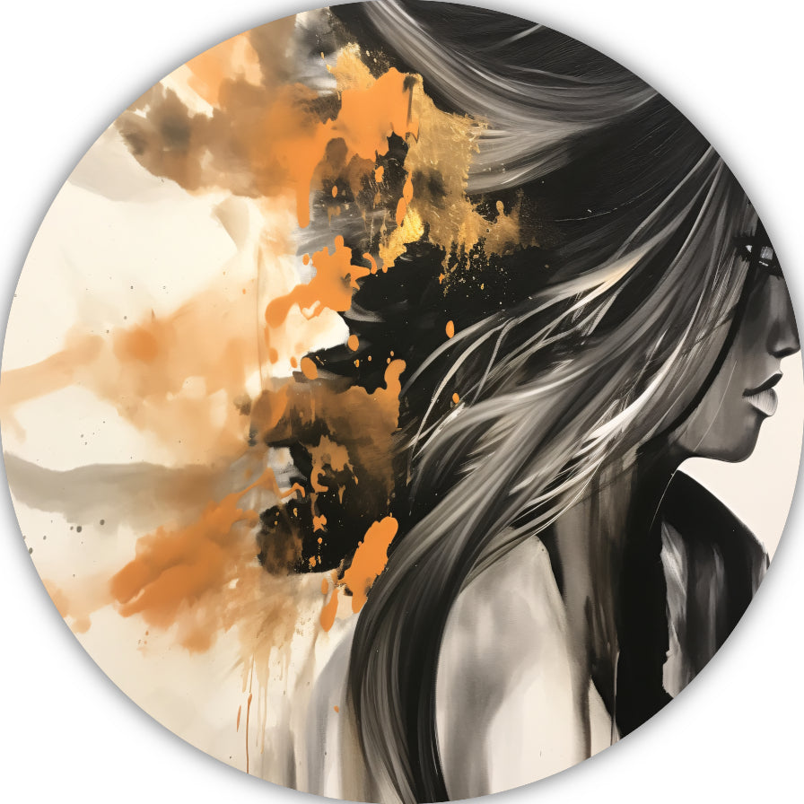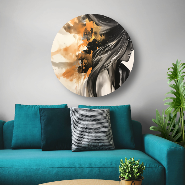 Dynamische Vrouw in Oranje en Goud aluminium muurcirkel