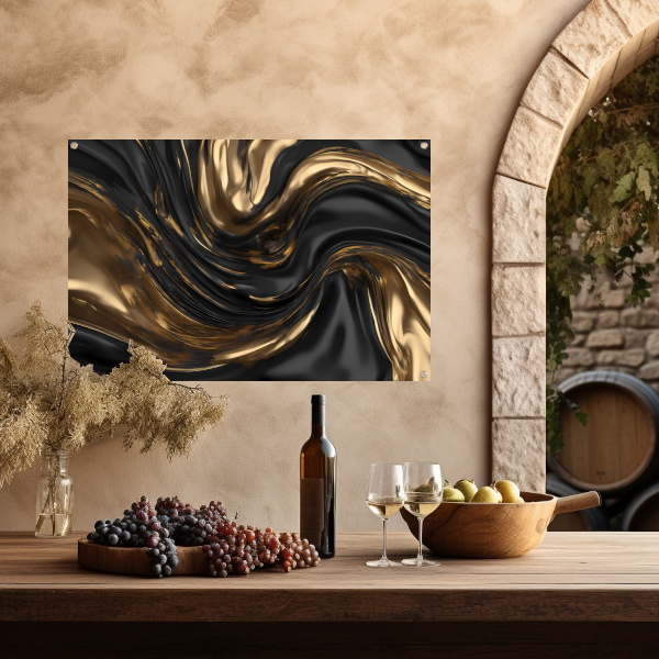 Het thema van deze tuinposter is abstractie, wat betekent dat het geen specifieke afbeelding of voorstelling heeft. Dit geeft de poster een moderne en eigentijdse uitstraling. De kleuren zwart en goud zijn perfect gecombineerd en zorgen voor een dynamisch contrast. Dit maakt de poster een echte eyecatcher in elke tuin.