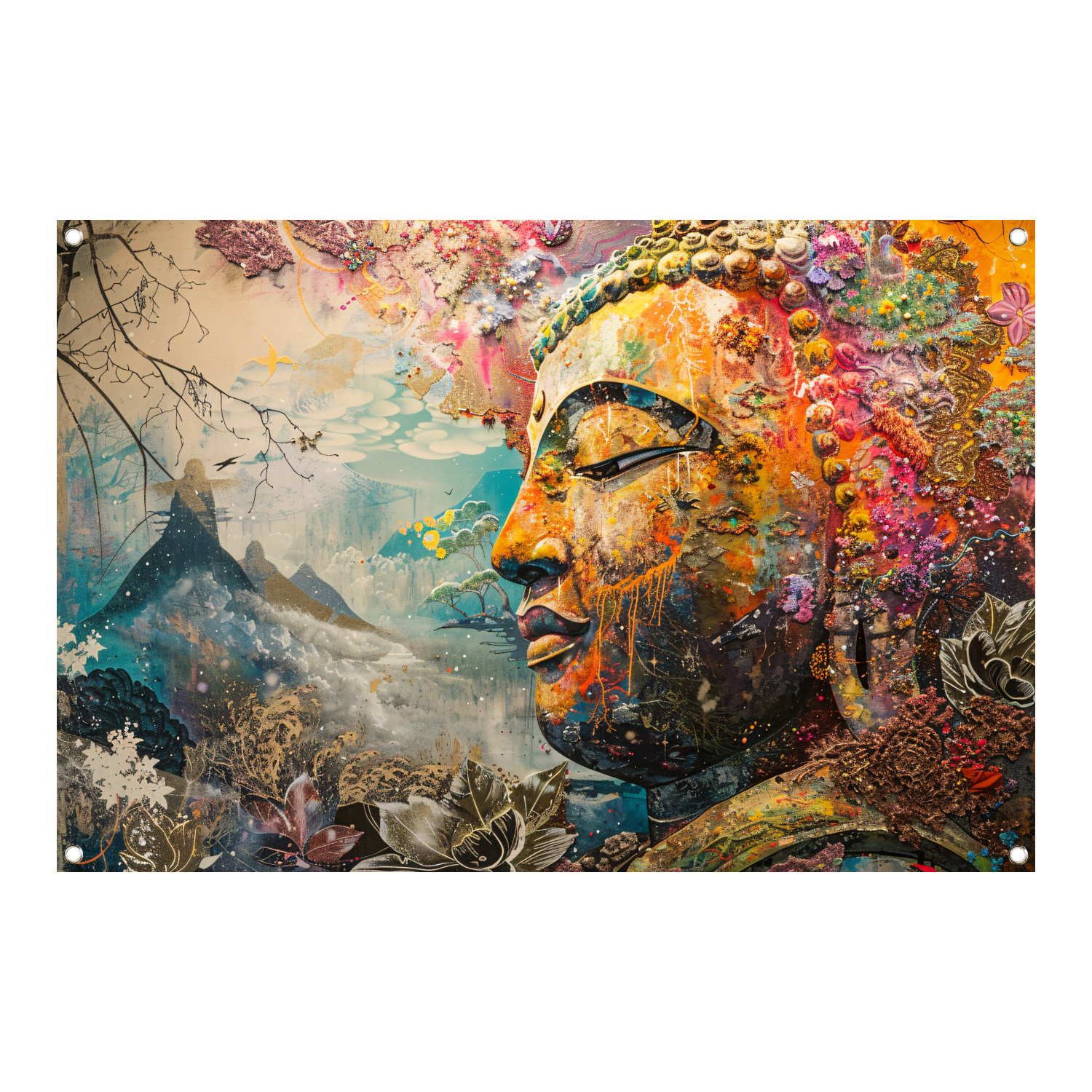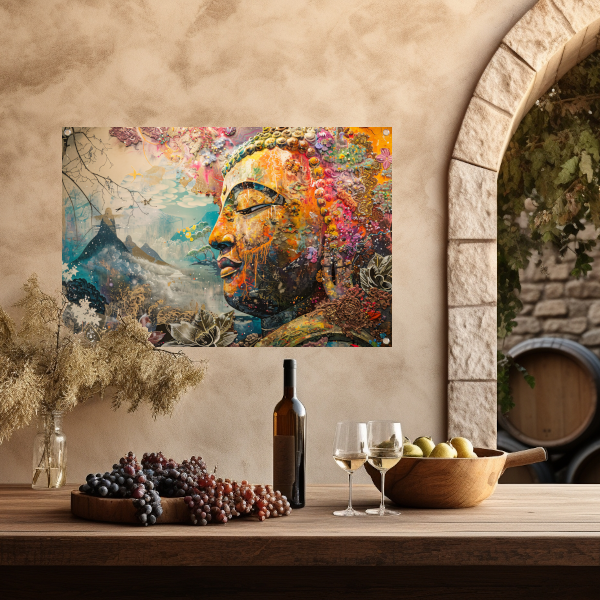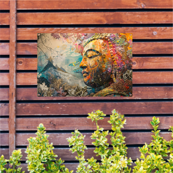Eclectische Boeddha met Kleurrijke Achtergrond tuinposter