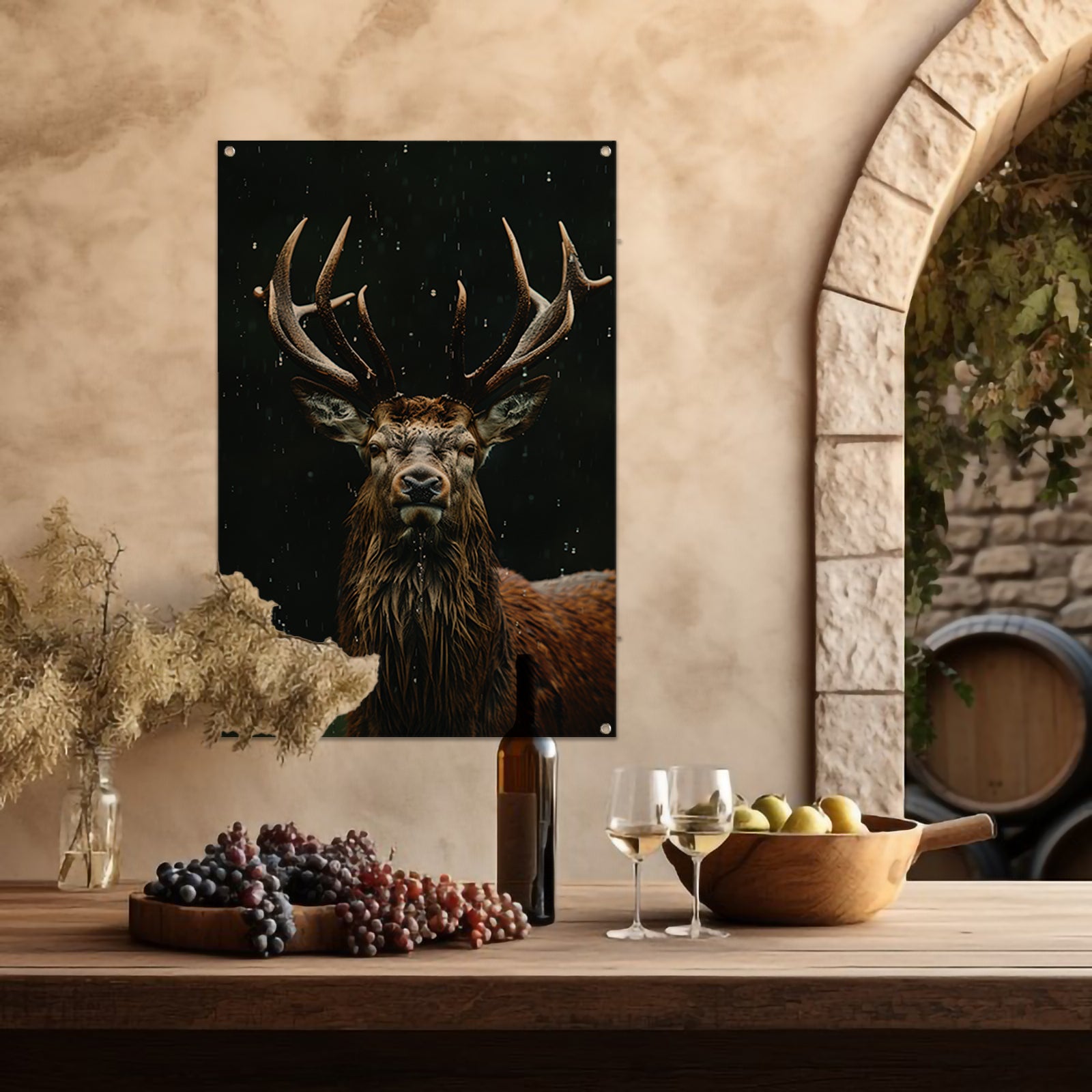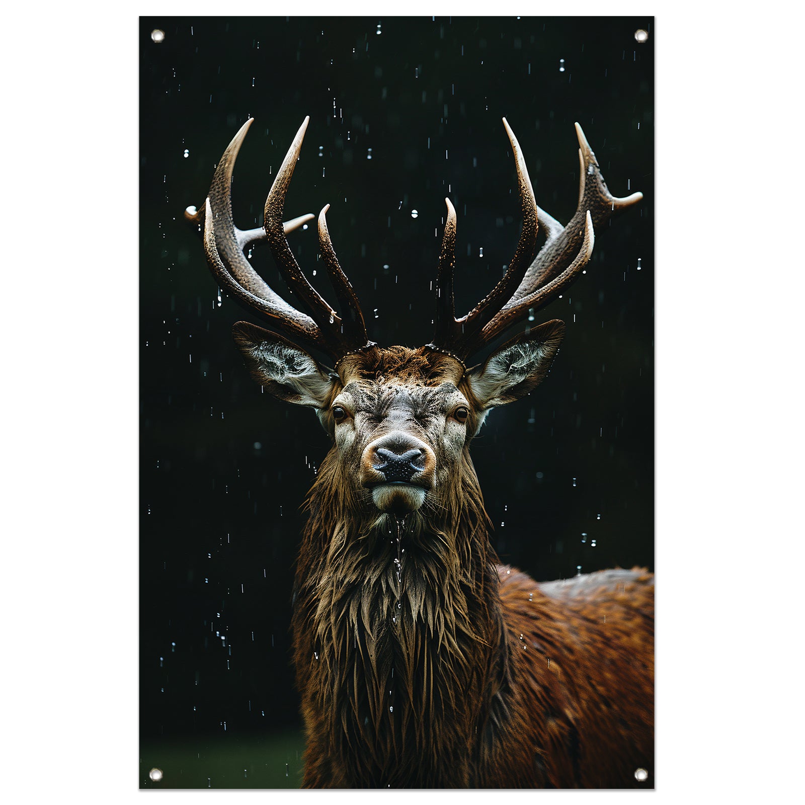 Edelhert in de Stortregen: Een Portret van Kracht tuinposter