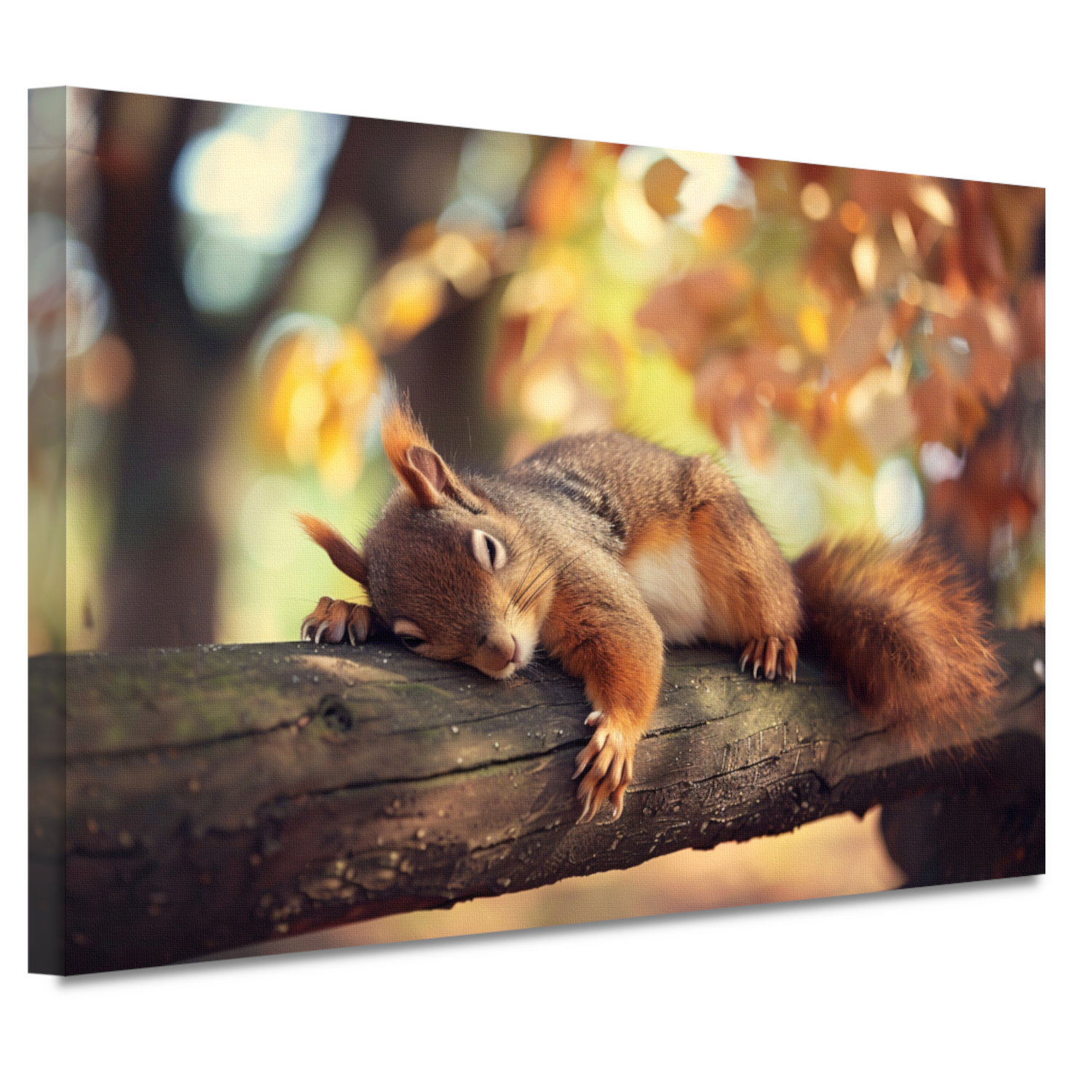 Breng een vleugje rust en warmte in je interieur met dit schattige canvas schilderij. De afbeelding toont een knusse eekhoorn die heerlijk ligt te slapen op een boomstam, omringd door warme herfstkleuren.
