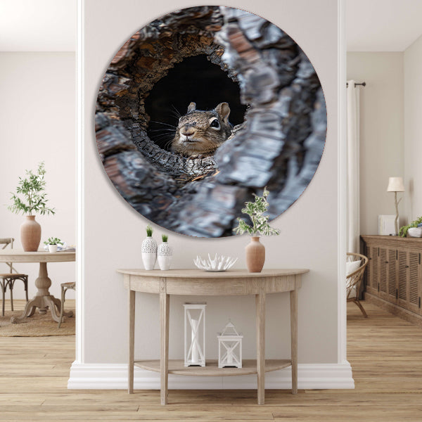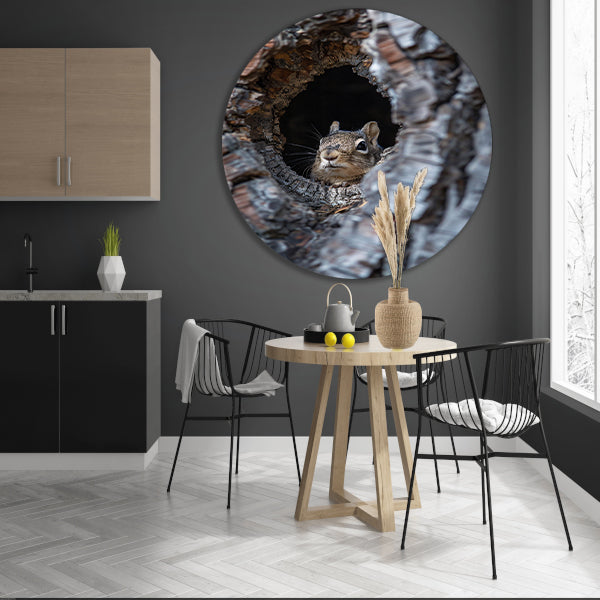 Eekhoorn gluurt uit boomstam aluminium muurcirkel