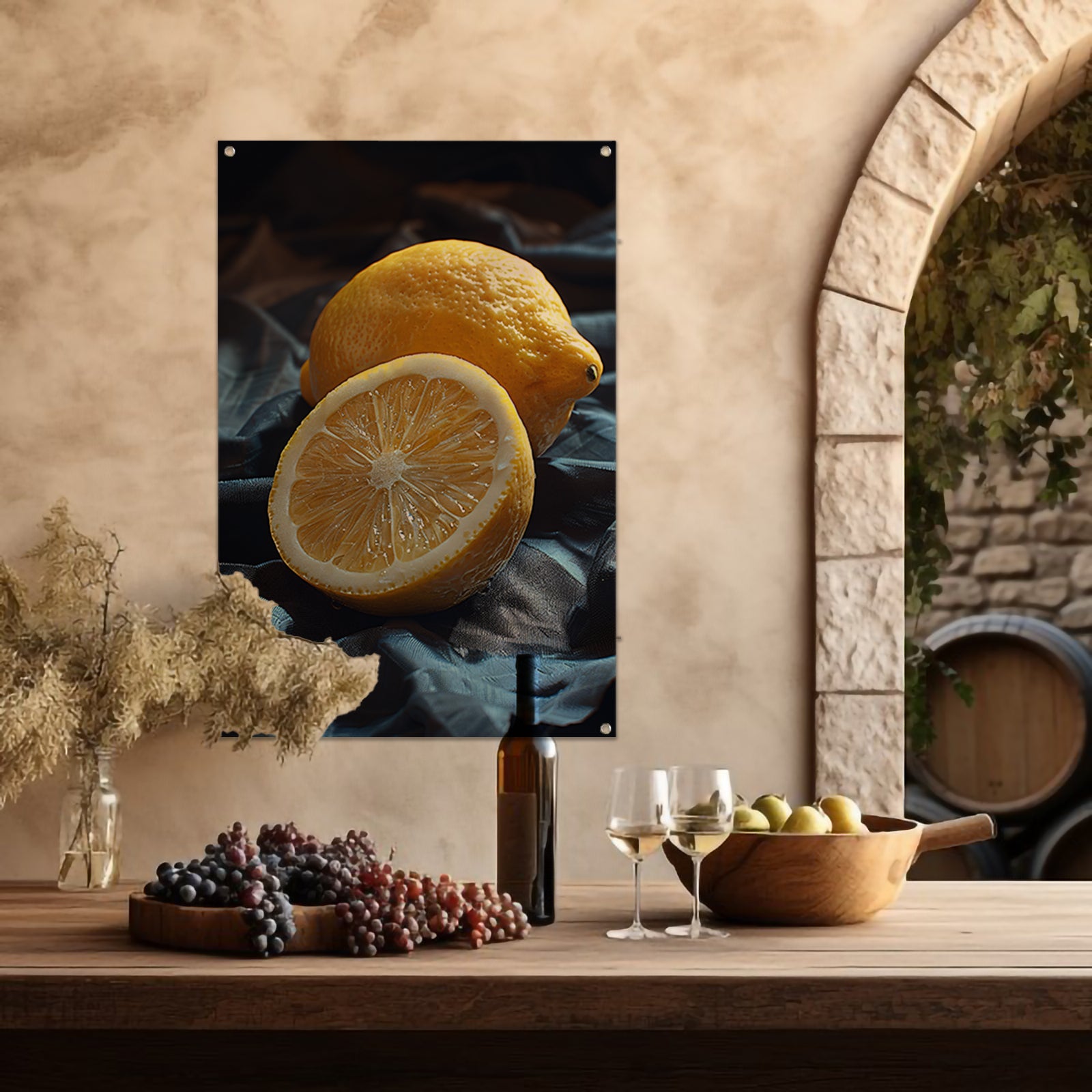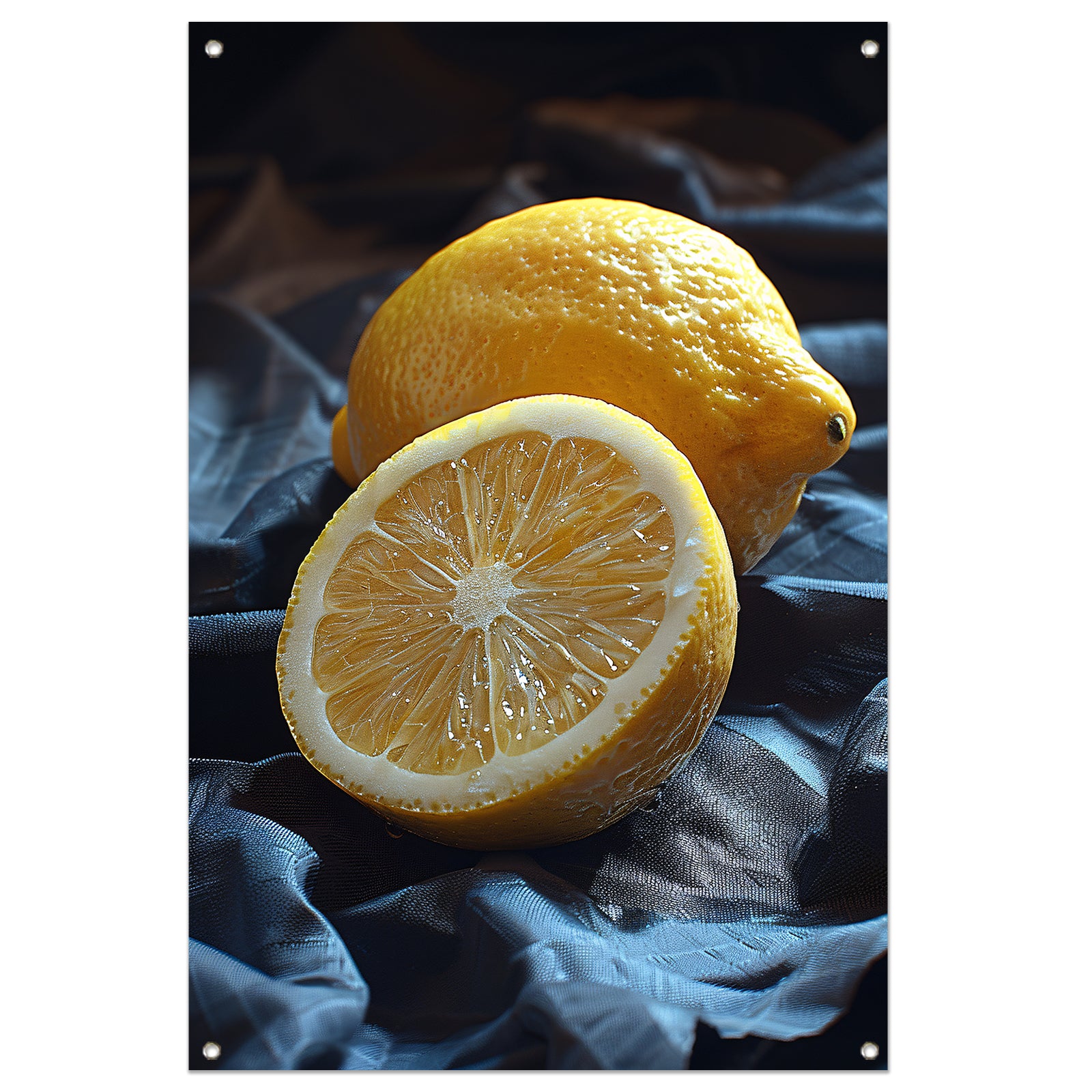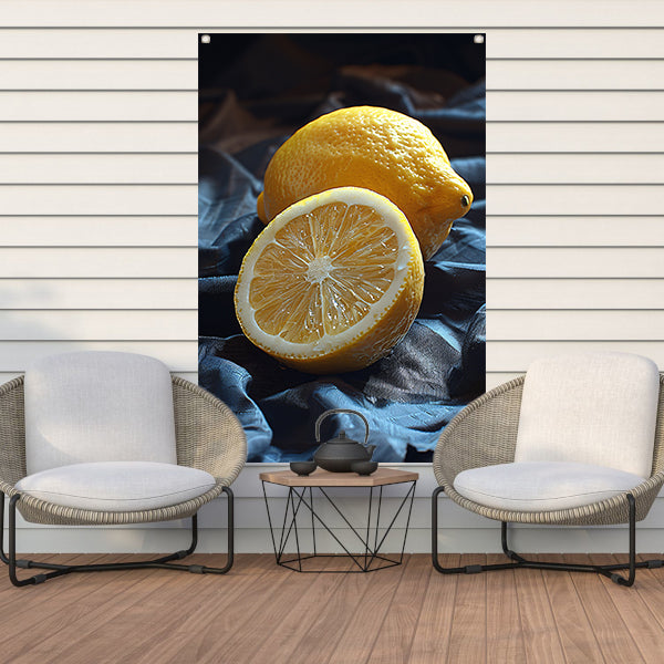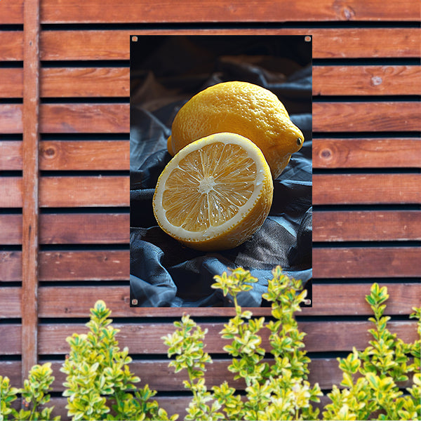 Een citroen, gesneden en ongesneden, op een doek tuinposter
