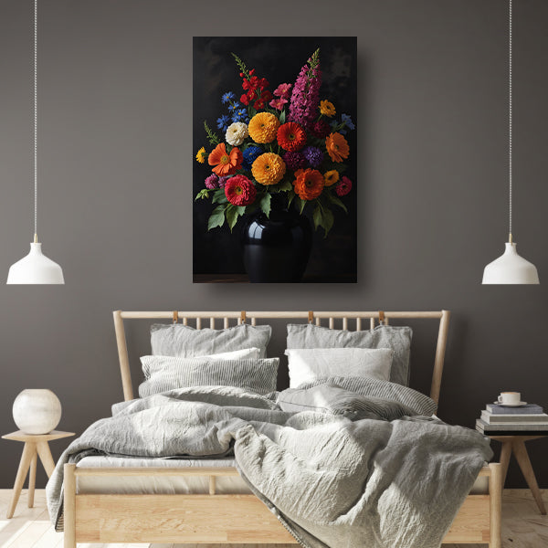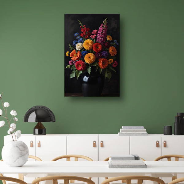 Een symfonie van bloemen in donkere elegantie poster