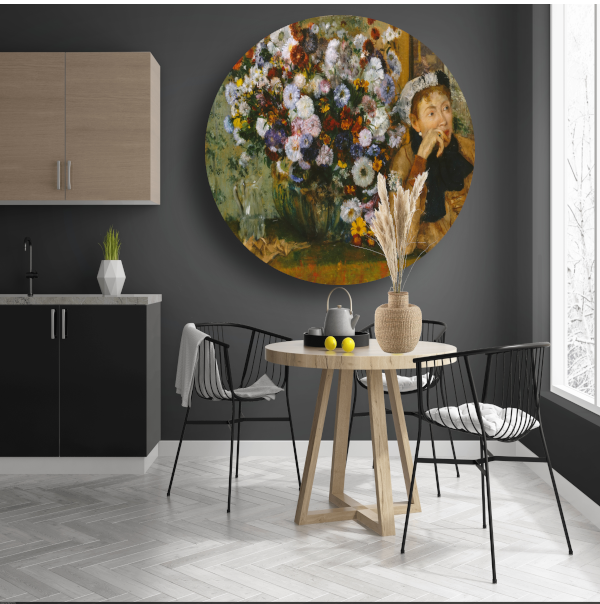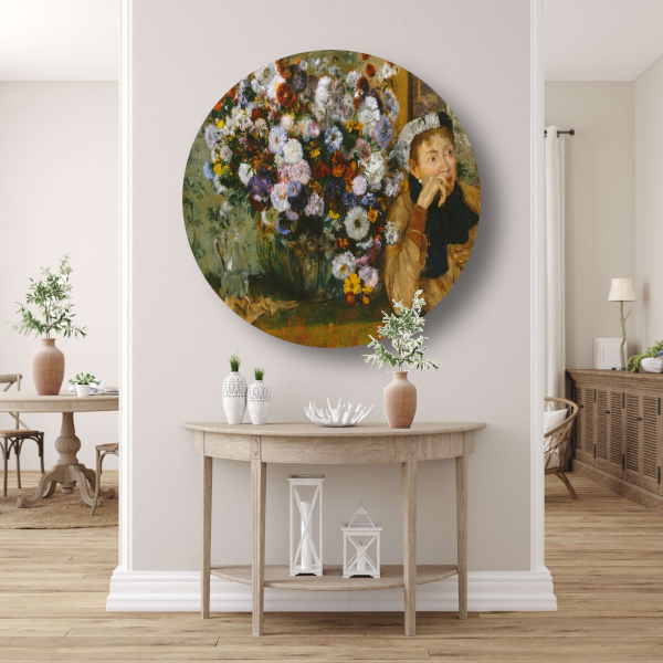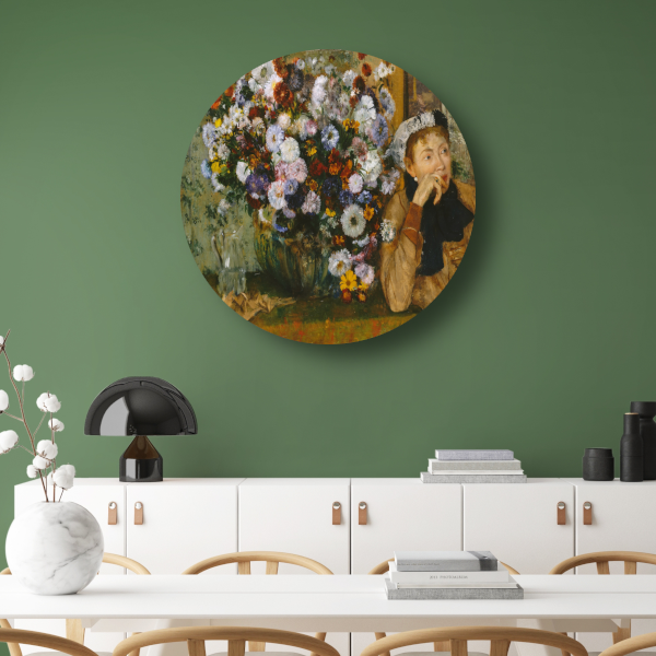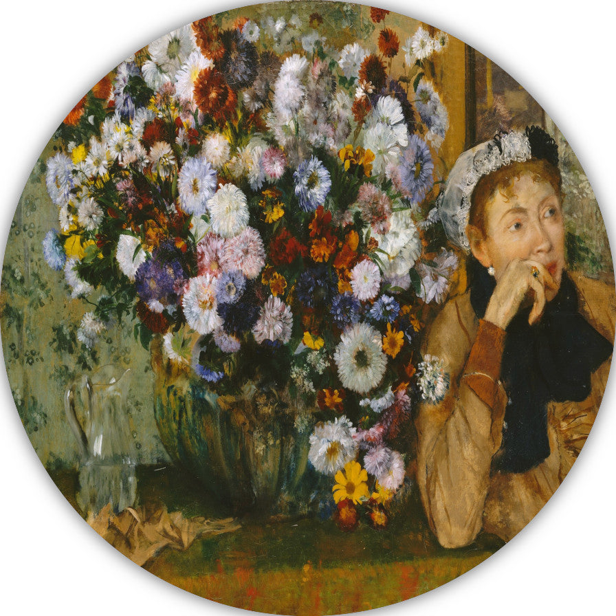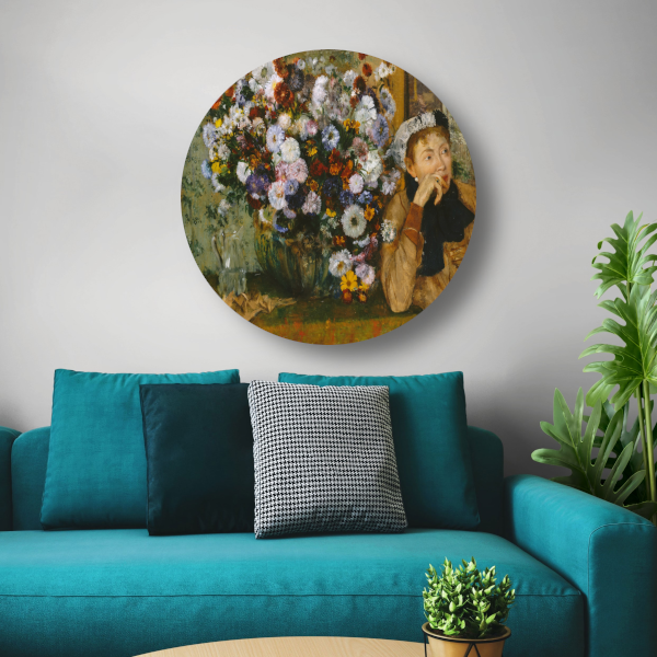 Een vrouw zittend naast een vaas met bloemen - Edgar Degas aluminium muurcirkel