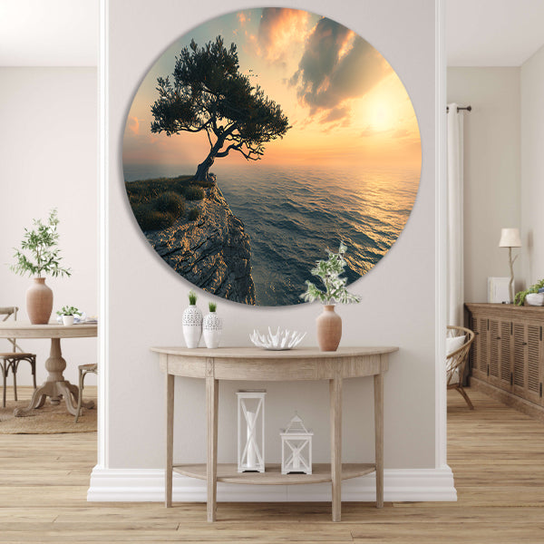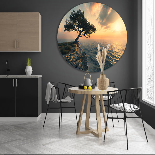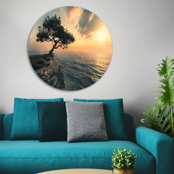 Eenzame boom op klif bij zonsondergang aluminium muurcirkel