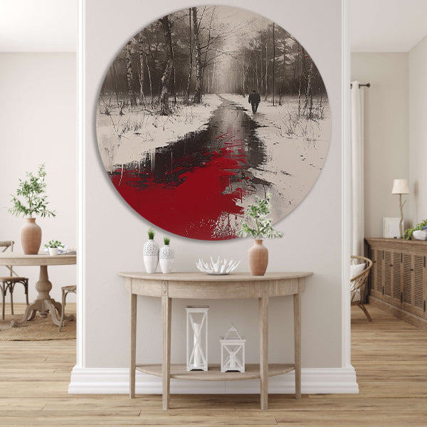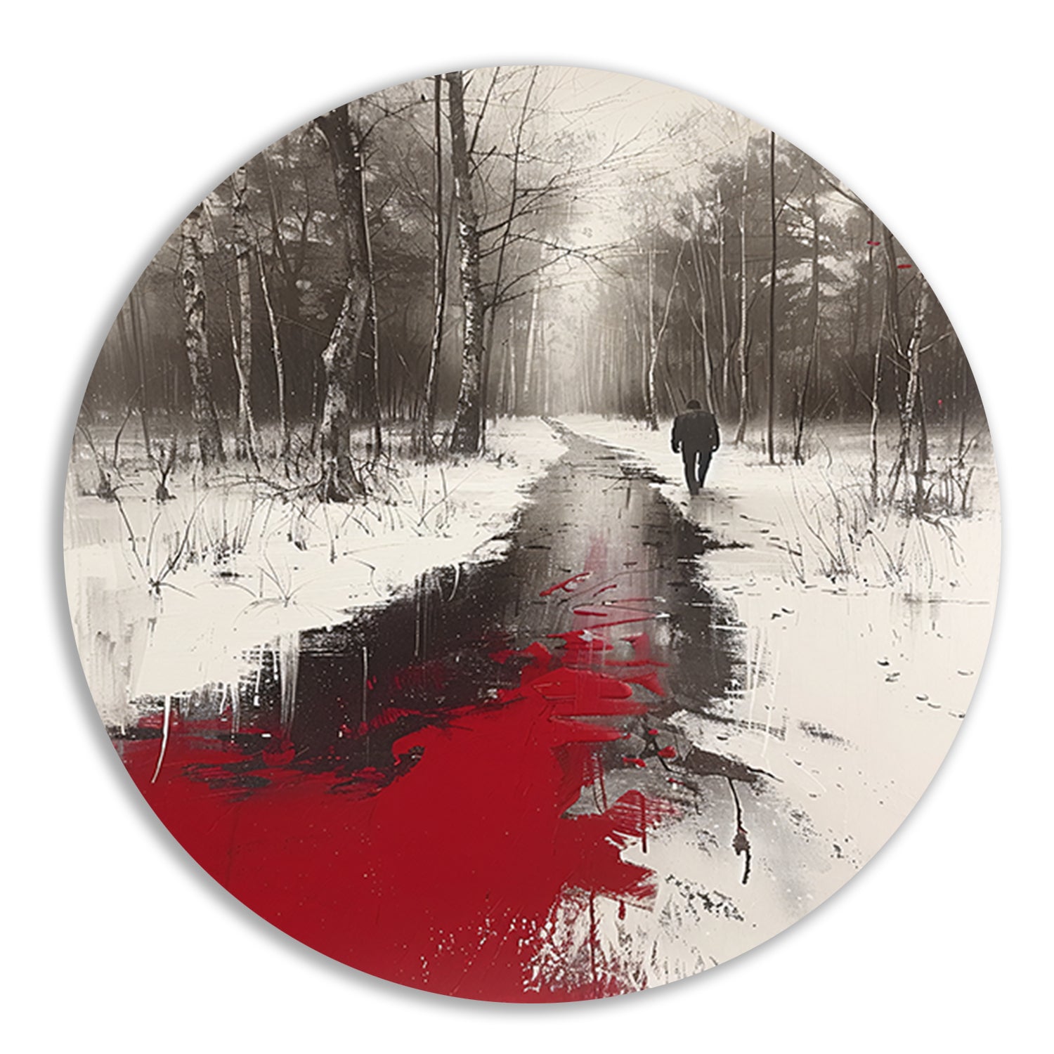 Eenzame figuur in een met bloed bevlekt bos aluminium muurcirkel