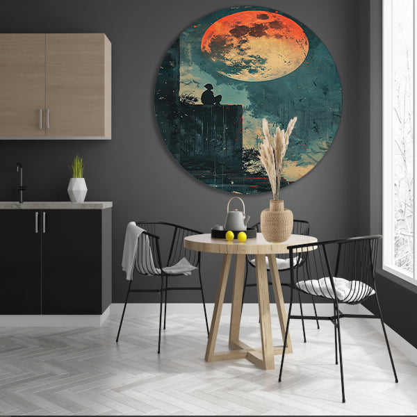 De afbeelding van de eenzame figuur onder de rode maan zorgt voor een intrigerend en surrealistisch element in je huis. Of je nu kiest voor een kleinere muurcirkel voor een subtiel accent of een groter formaat als eyecatcher, dit kunstwerk zal zeker de aandacht trekken van al je gasten.