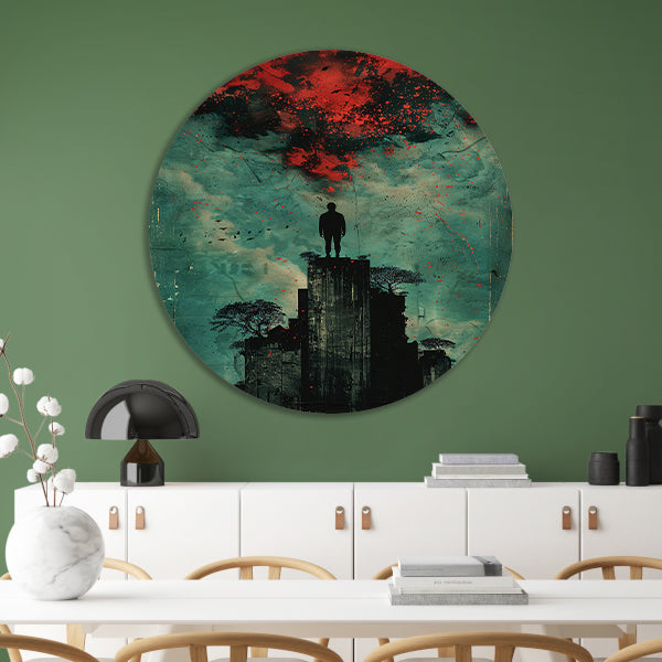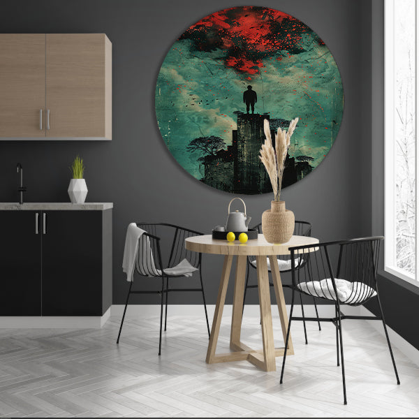 De combinatie van het intrigerende beeld van de eenzame mens in de vervallen stad en de rode lucht zorgt voor een mysterieuze en sfeervolle uitstraling. Voeg een vleugje kunstzinnigheid toe aan jouw interieur met deze prachtige muurcirkel.