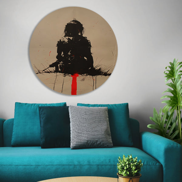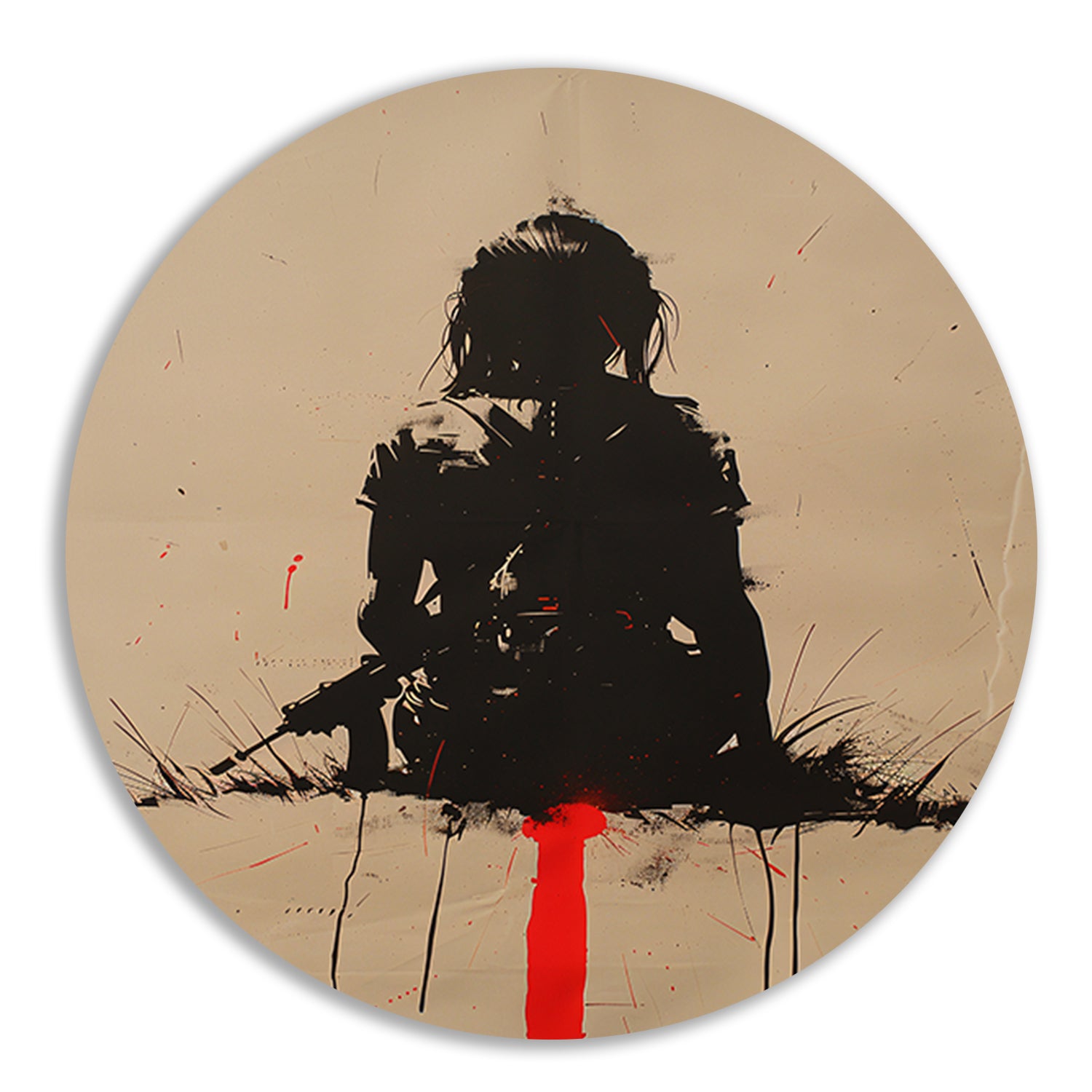 Eenzame vrouwelijke krijger in desolate omgeving aluminium muurcirkel