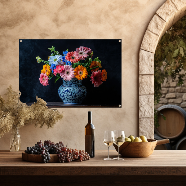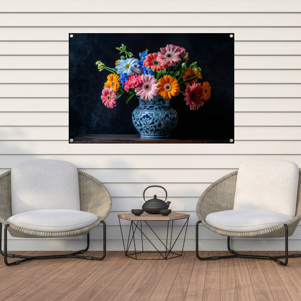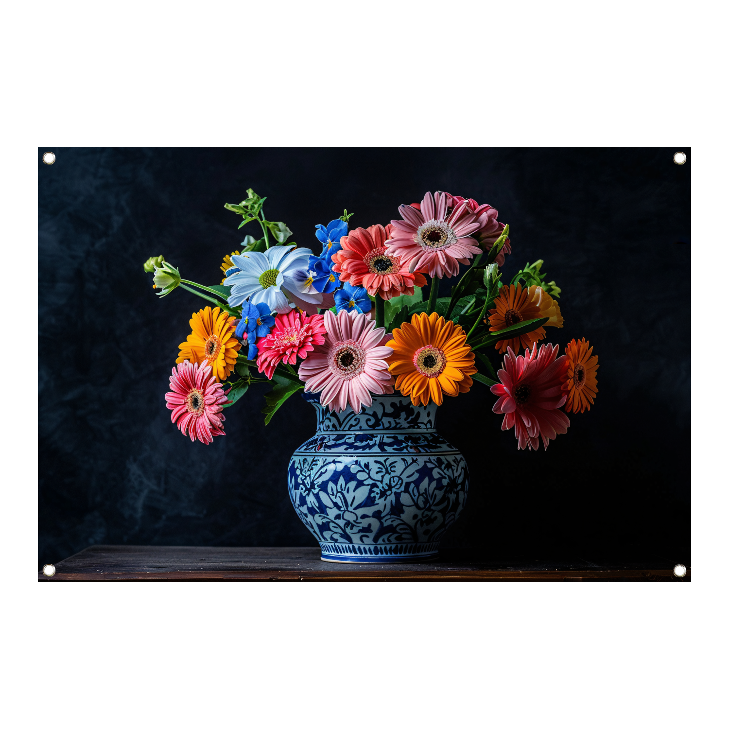 Elegant bloemenboeket in blauw-witte keramische vaas tuinposter