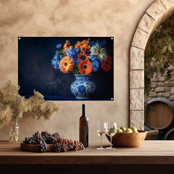 Elegante Bloemensamenstelling in Delfts Blauwe Vaas tuinposter