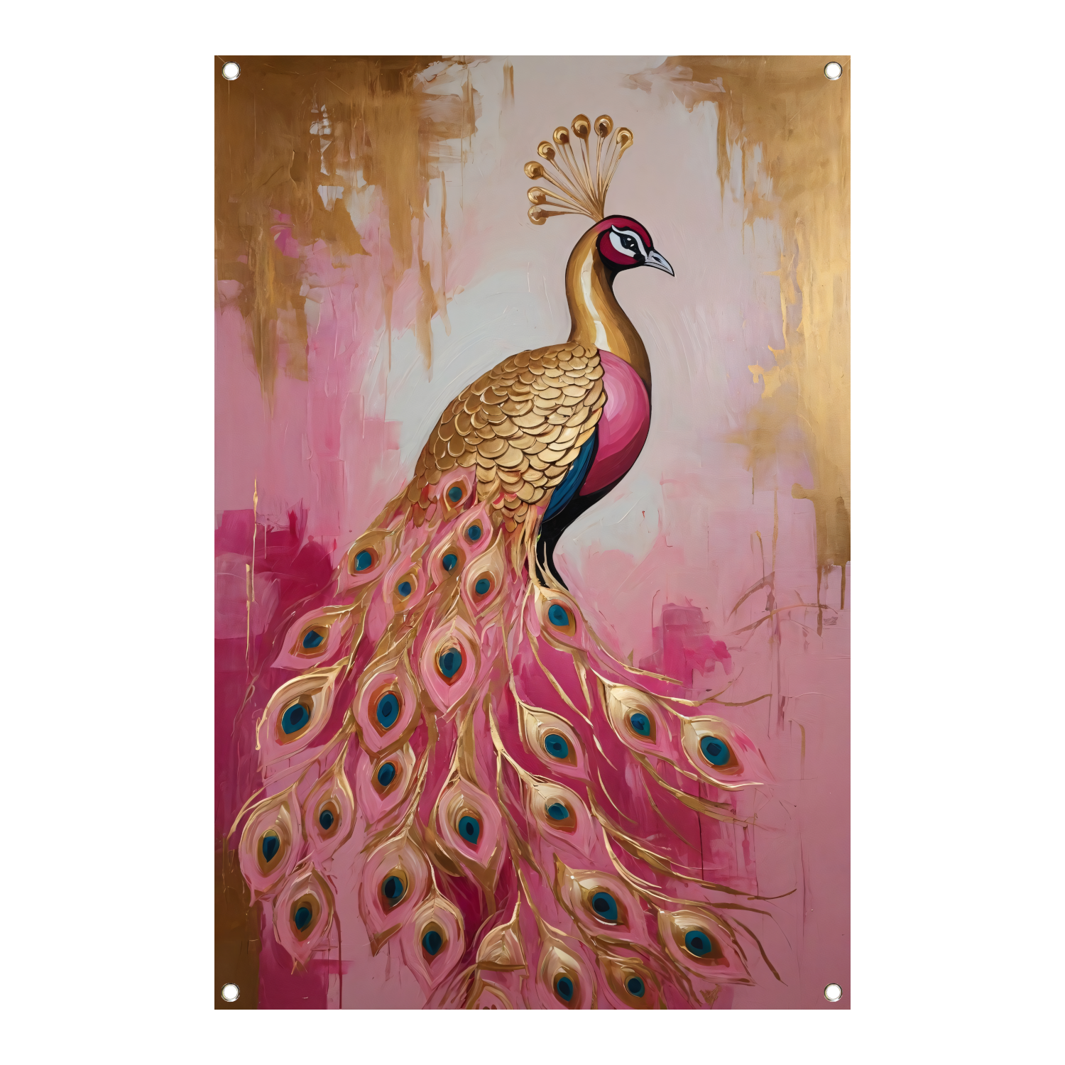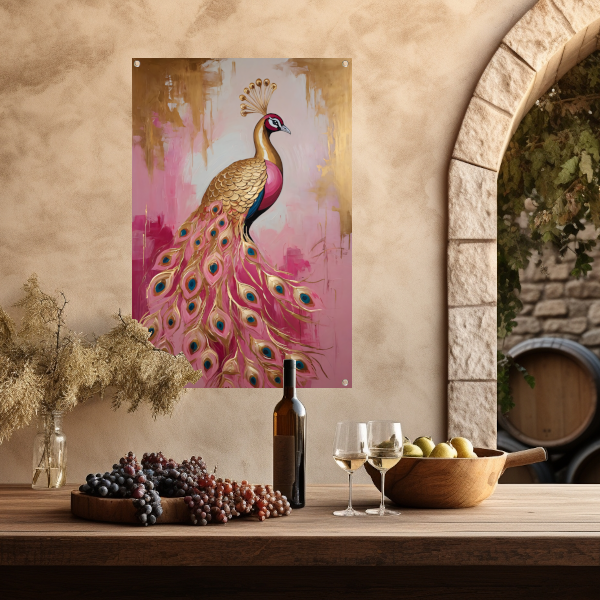 Elegante Gouden Pauw op Roze Achtergrond tuinposter