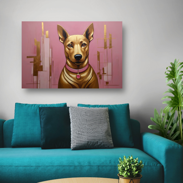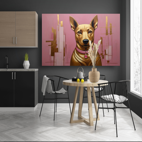 Bestel nu en geef je interieur een stijlvolle upgrade met deze prachtige hond in roze en goud acrylglas!