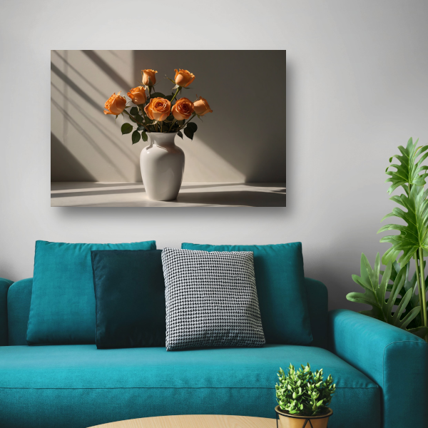 Elegante oranje rozen in witte vaas canvas met baklijst