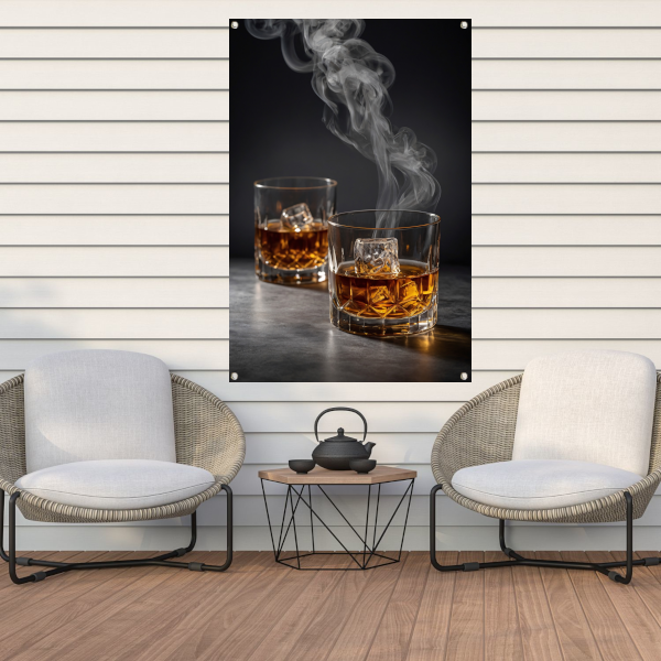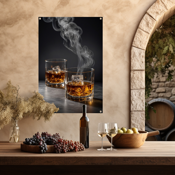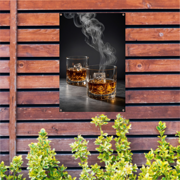 Elegante whiskeyglazen met rook op zwarte achtergrond tuinposter