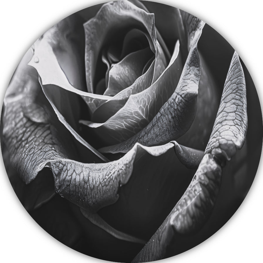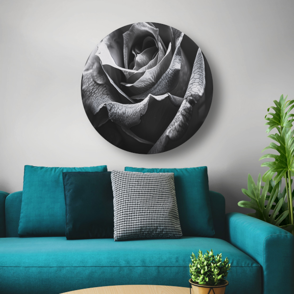 Elegante zwart-witte roos met gedetailleerde druppels aluminium muurcirkel