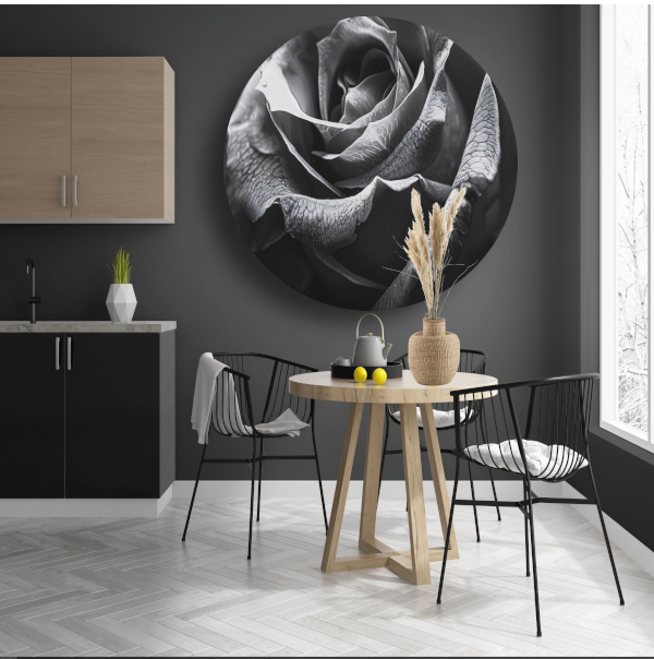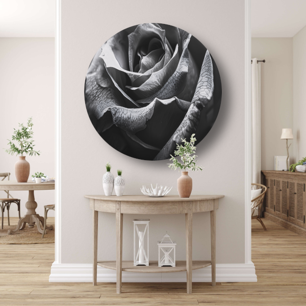 Voeg een vleugje elegantie en stijl toe aan elke ruimte in huis met deze prachtige zwart-witte roos muurcirkel met gedetailleerde druppels.