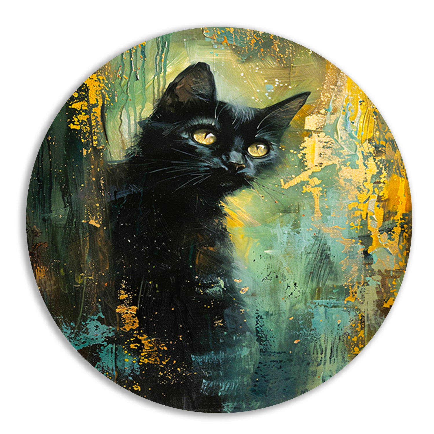 Elegante zwarte kat met dynamische achtergrond aluminium muurcirkel