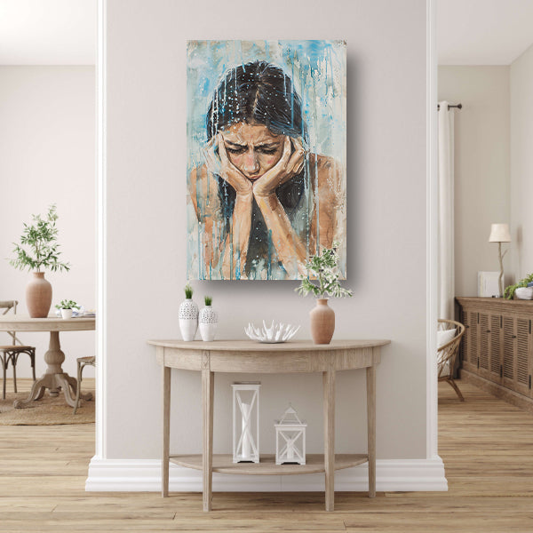 Emotionele vrouw geschilderd in aquarel canvas met baklijst