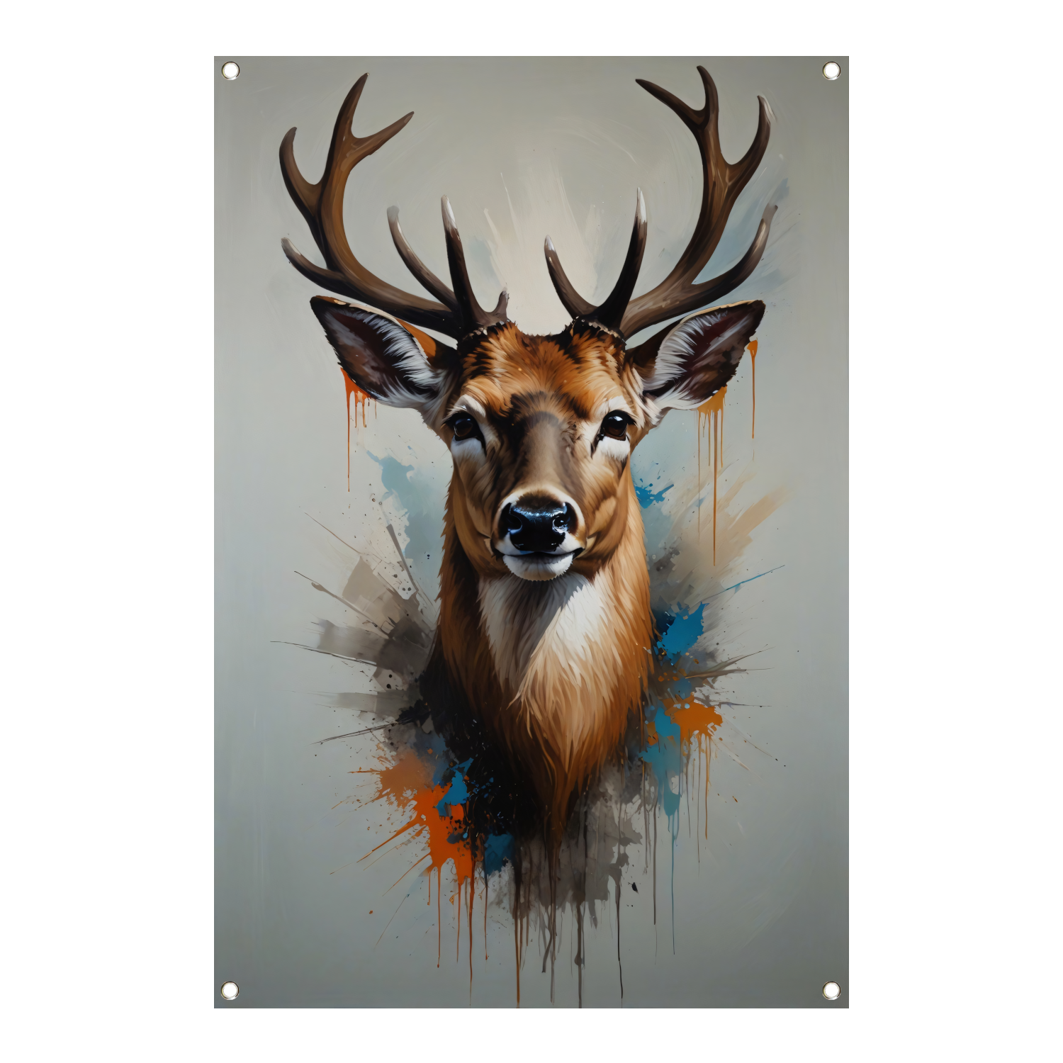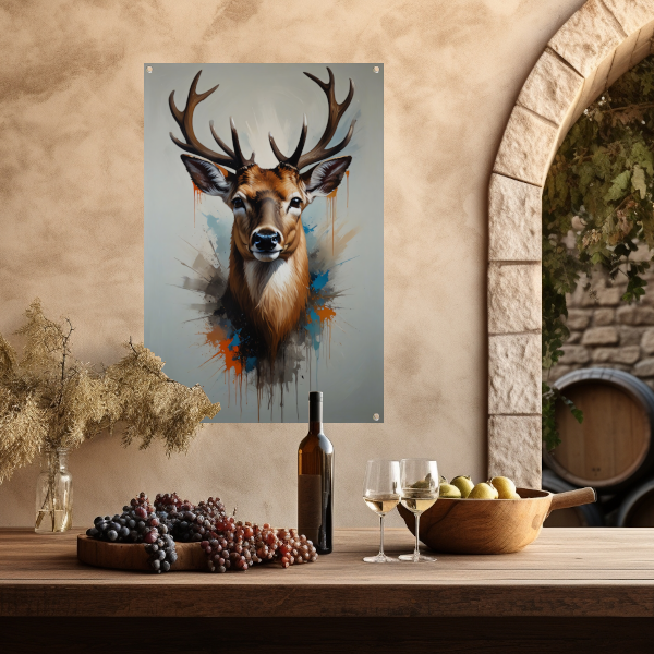 Expressief Hertenportret met Kleurrijke Spatten tuinposter