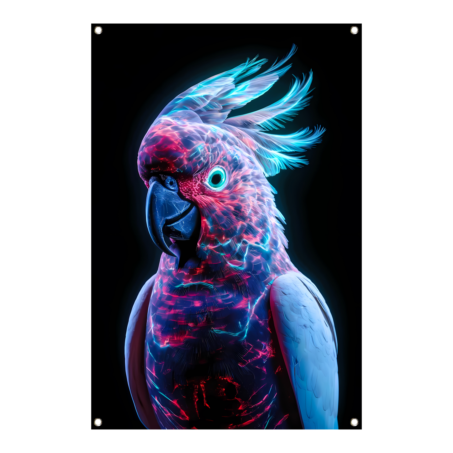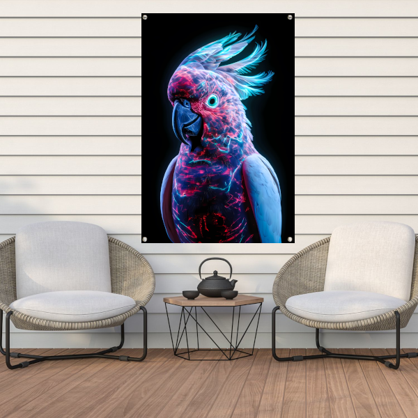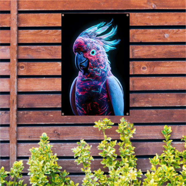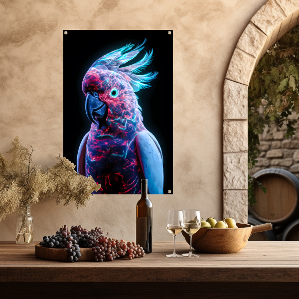 Futuristische bioluminescente papegaai op donkere achtergrond tuinposter