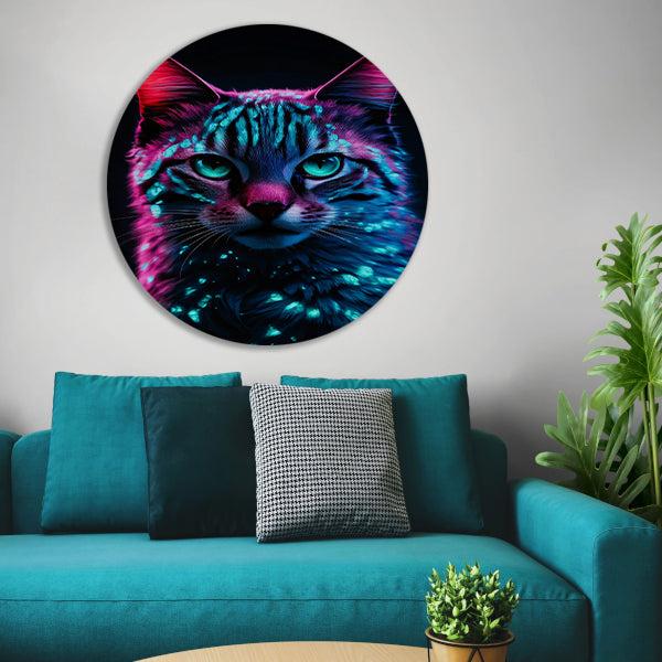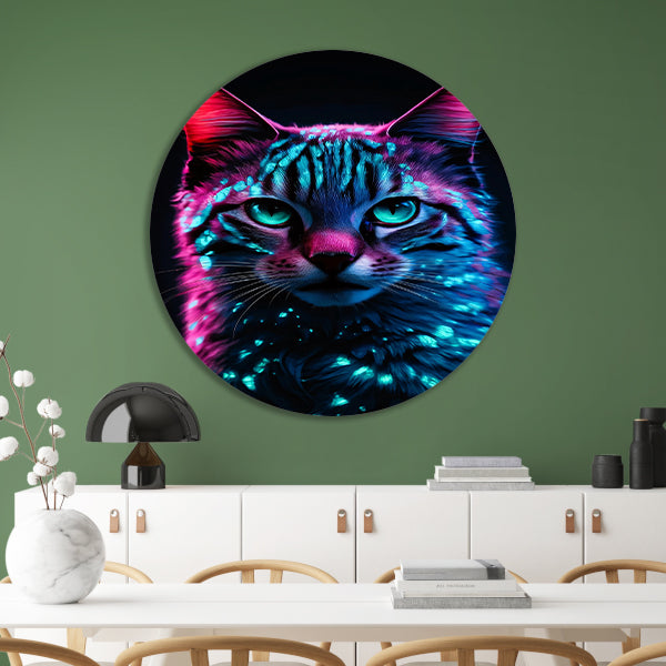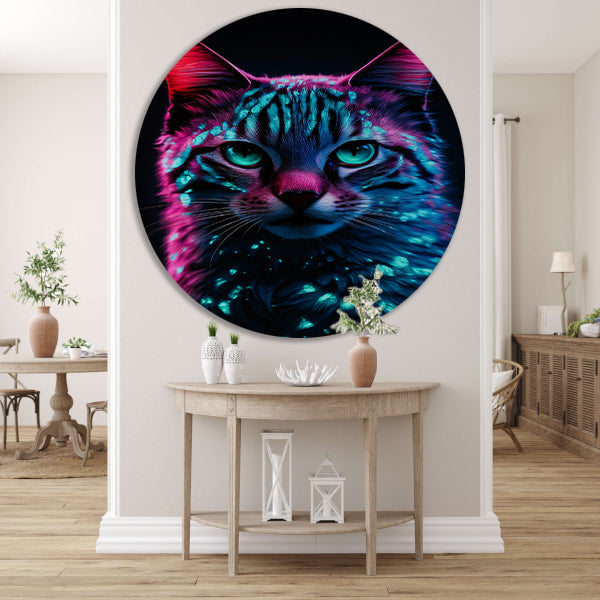 Futuristische neon kat in digitale kunst aluminium muurcirkel