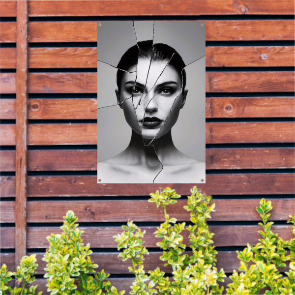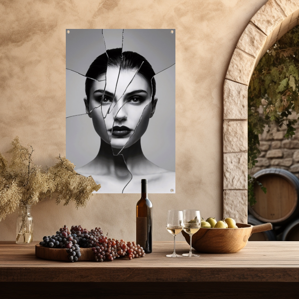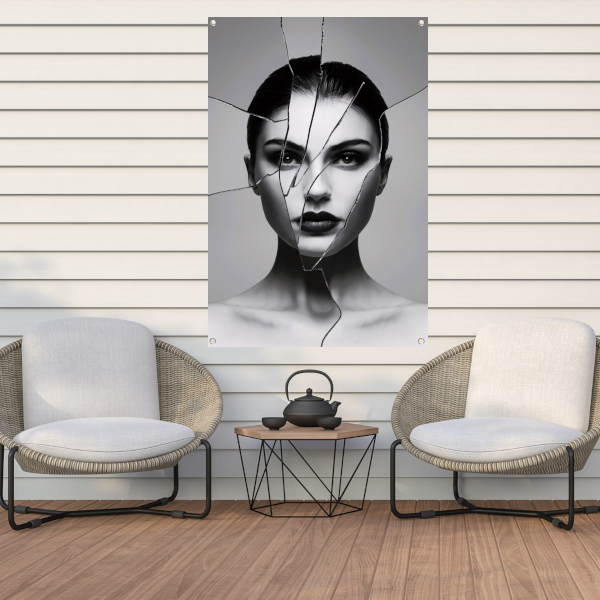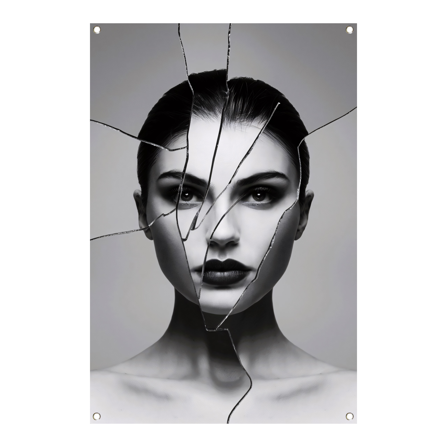 Gebroken gezicht in zwart-witcontrast tuinposter