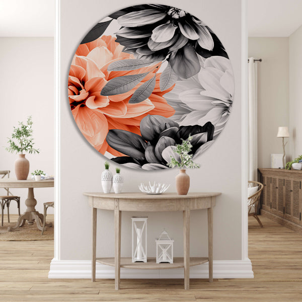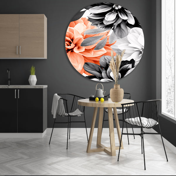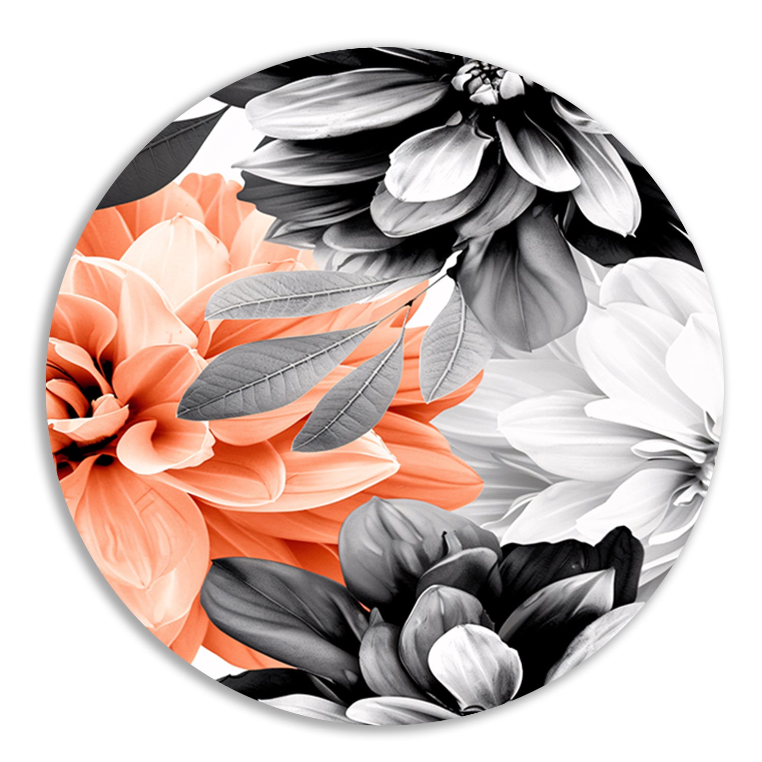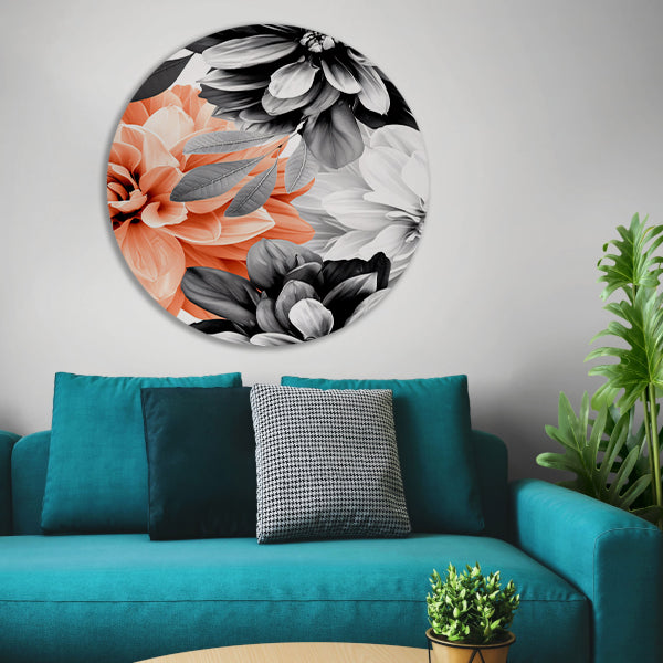 Gedetailleerde moderne bloemkunst in zwart-wit aluminium muurcirkel