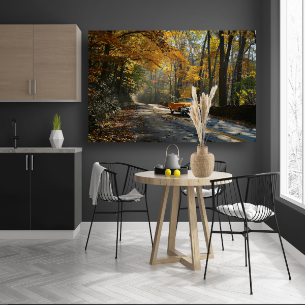 Gele auto in boslandschap canvas met baklijst