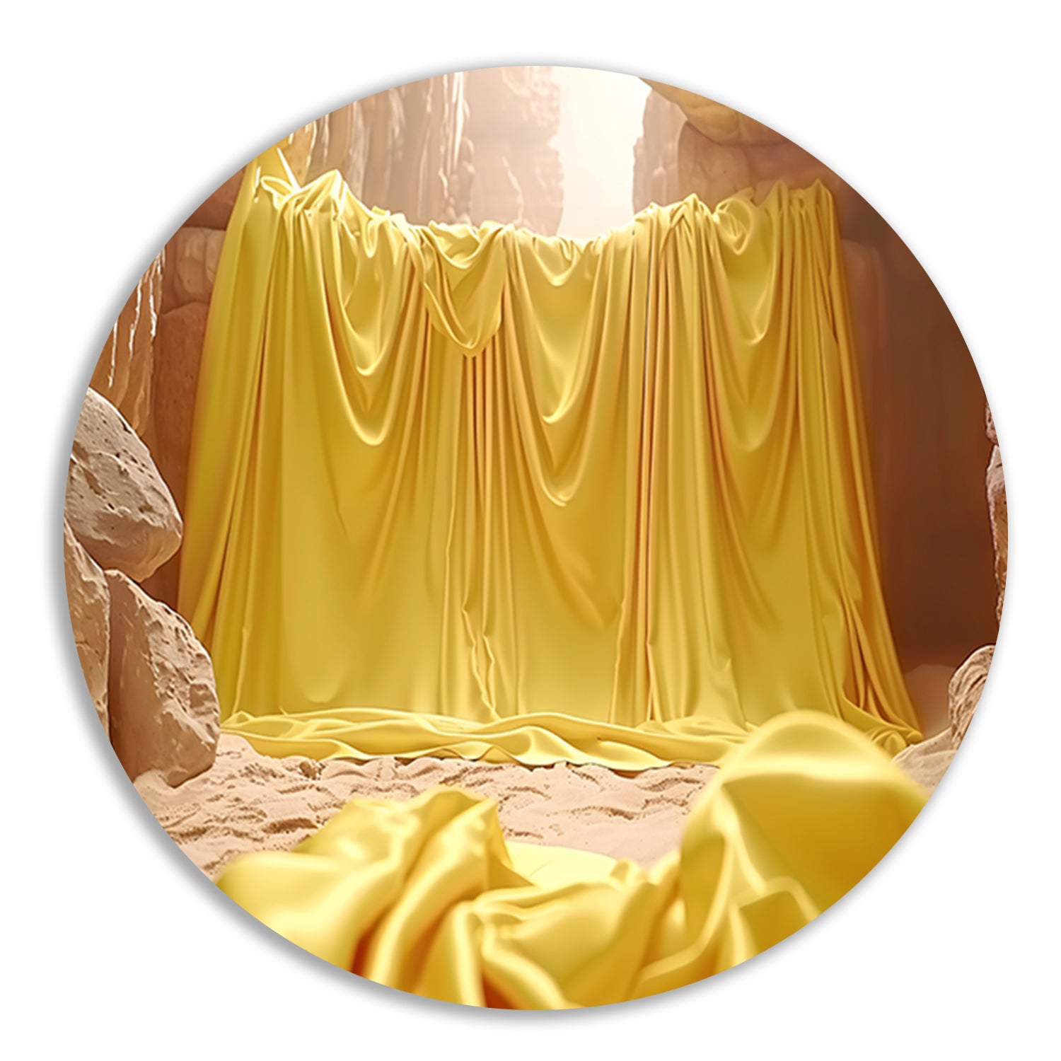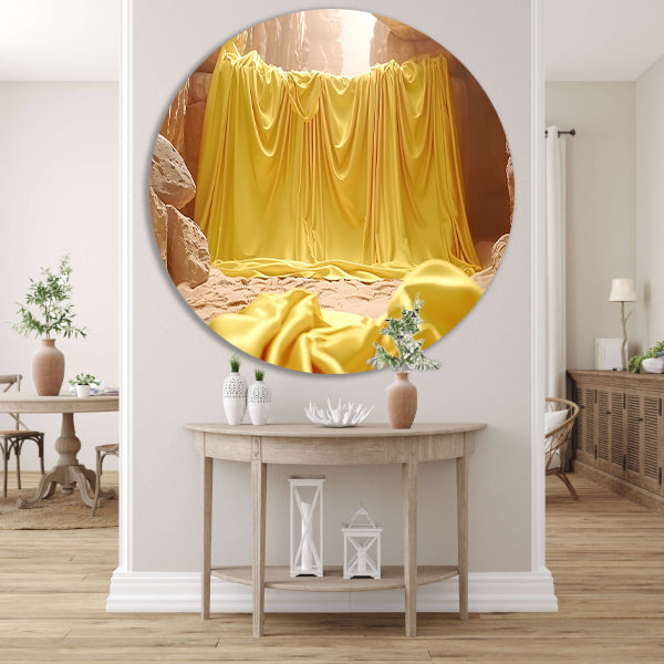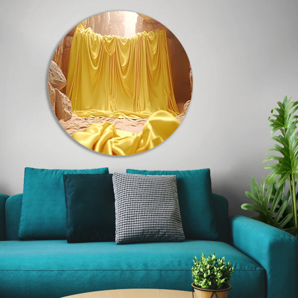 Gele doek in natuurlijke grot omgeving aluminium muurcirkel