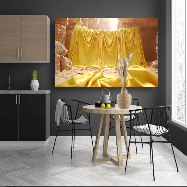 Gele doek in natuurlijke grot omgeving canvas met baklijst