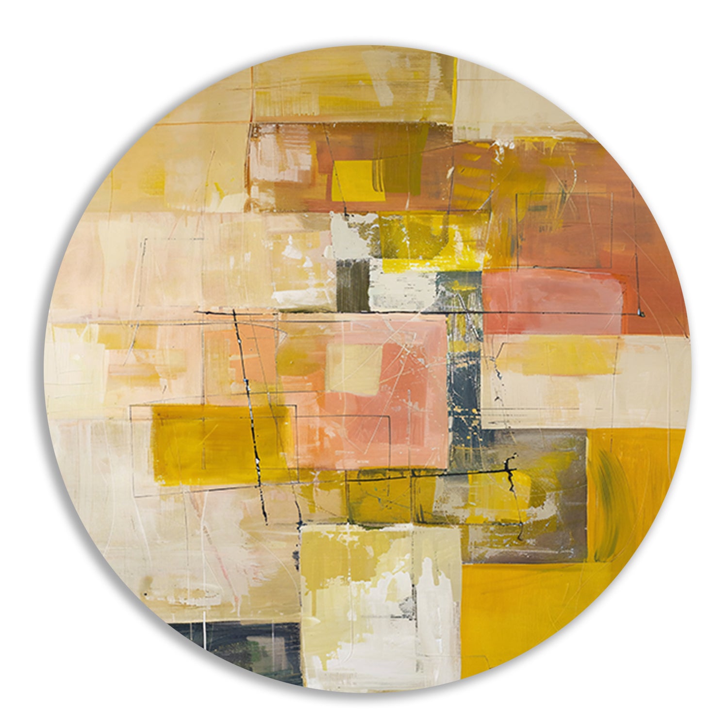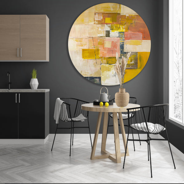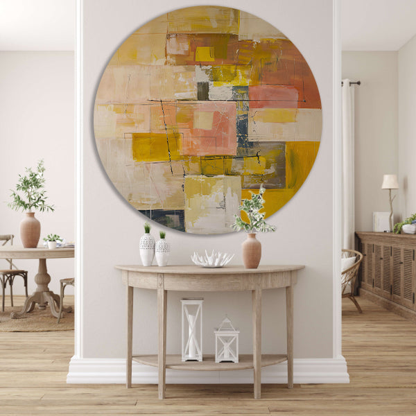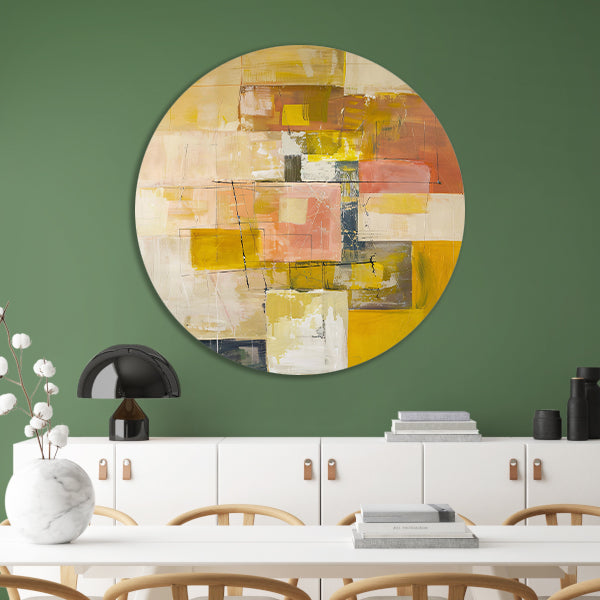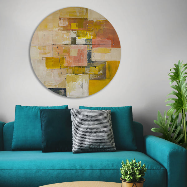 Geometrische abstractie in zachte kleurtonen aluminium muurcirkel