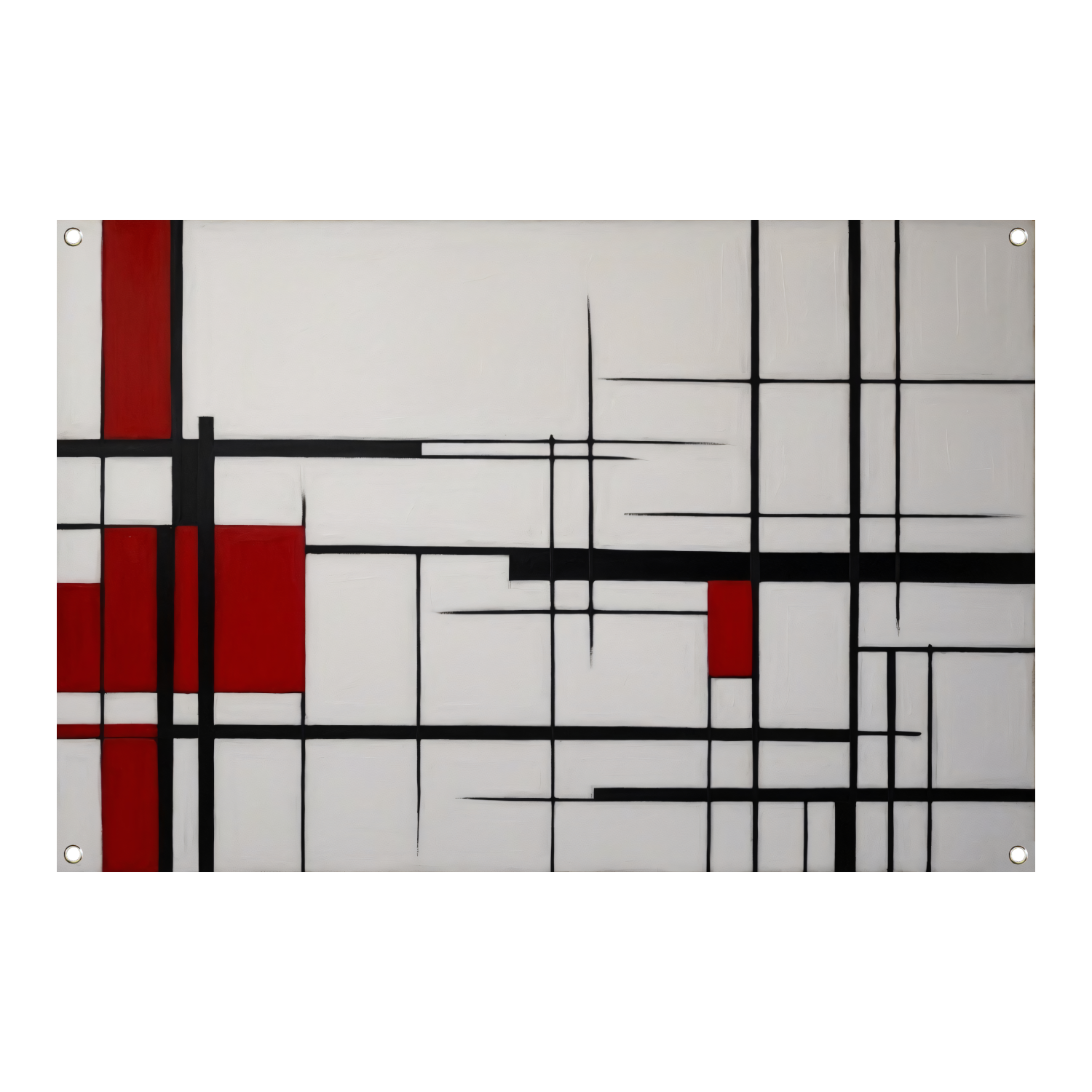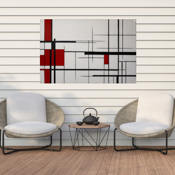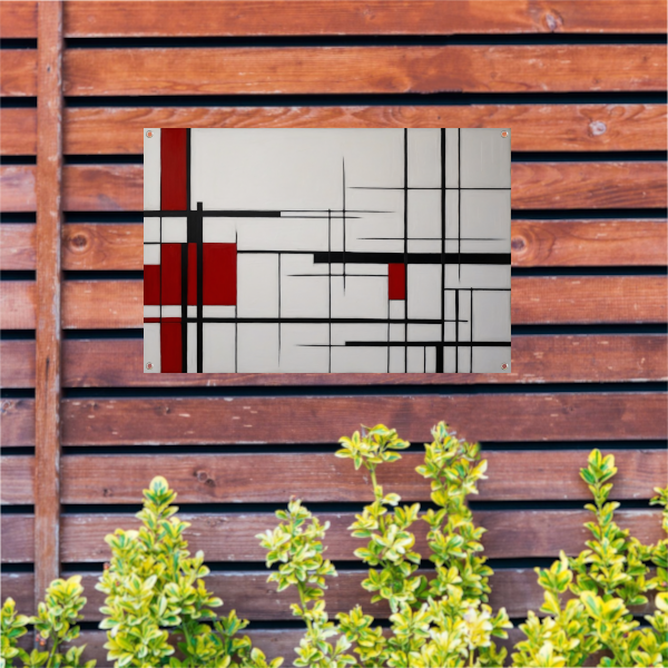 Geef je tuin een moderne en stijlvolle touch met onze Geometrische Harmonie in Rood, Zwart en Wit tuinposter. Deze liggende tuinposter is verkrijgbaar in verschillende formaten en is een echte eyecatcher voor elke buitenruimte.