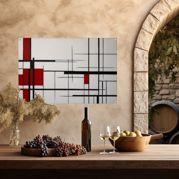 Het thema van deze tuinposter is geometrische harmonie, wat zorgt voor een strak en minimalistisch design. De kleuren rood, zwart en wit zijn perfect in balans en zorgen voor een krachtig contrast. Dit maakt de tuinposter geschikt voor zowel een moderne als een klassieke tuin.