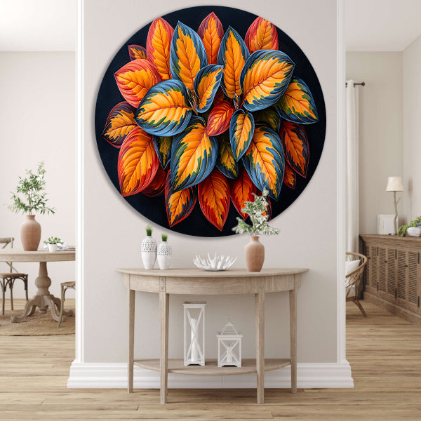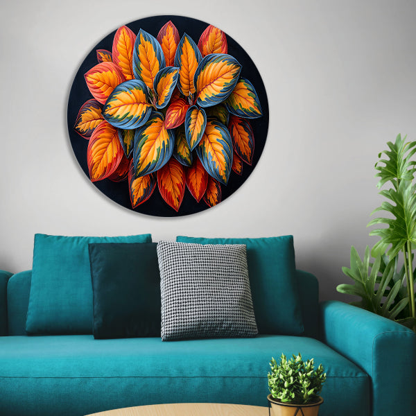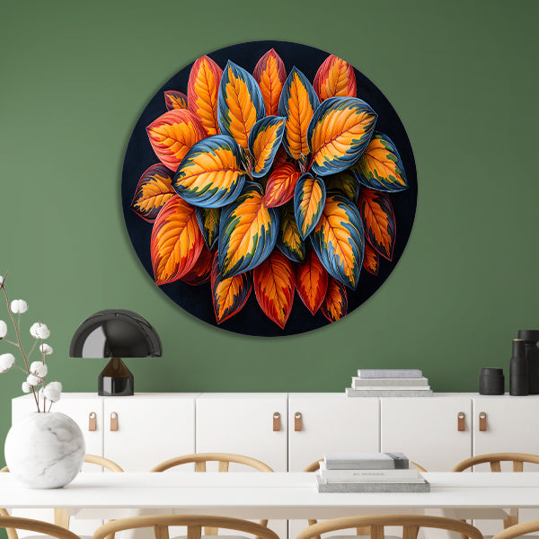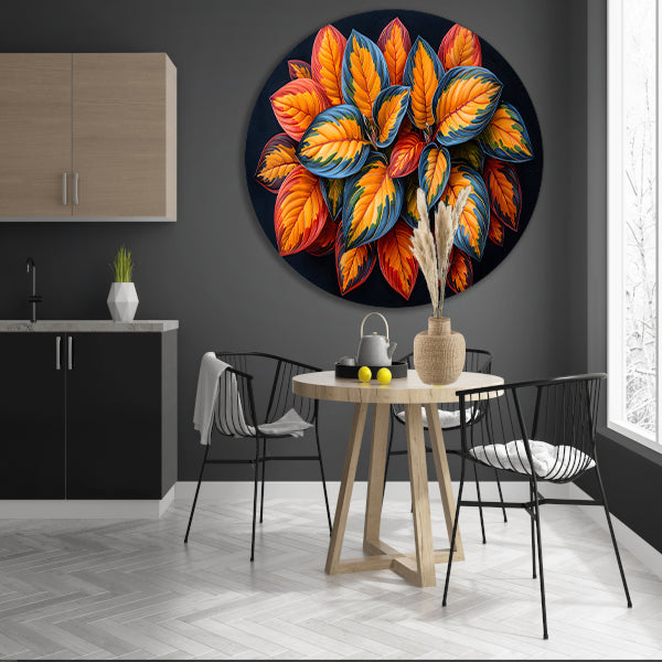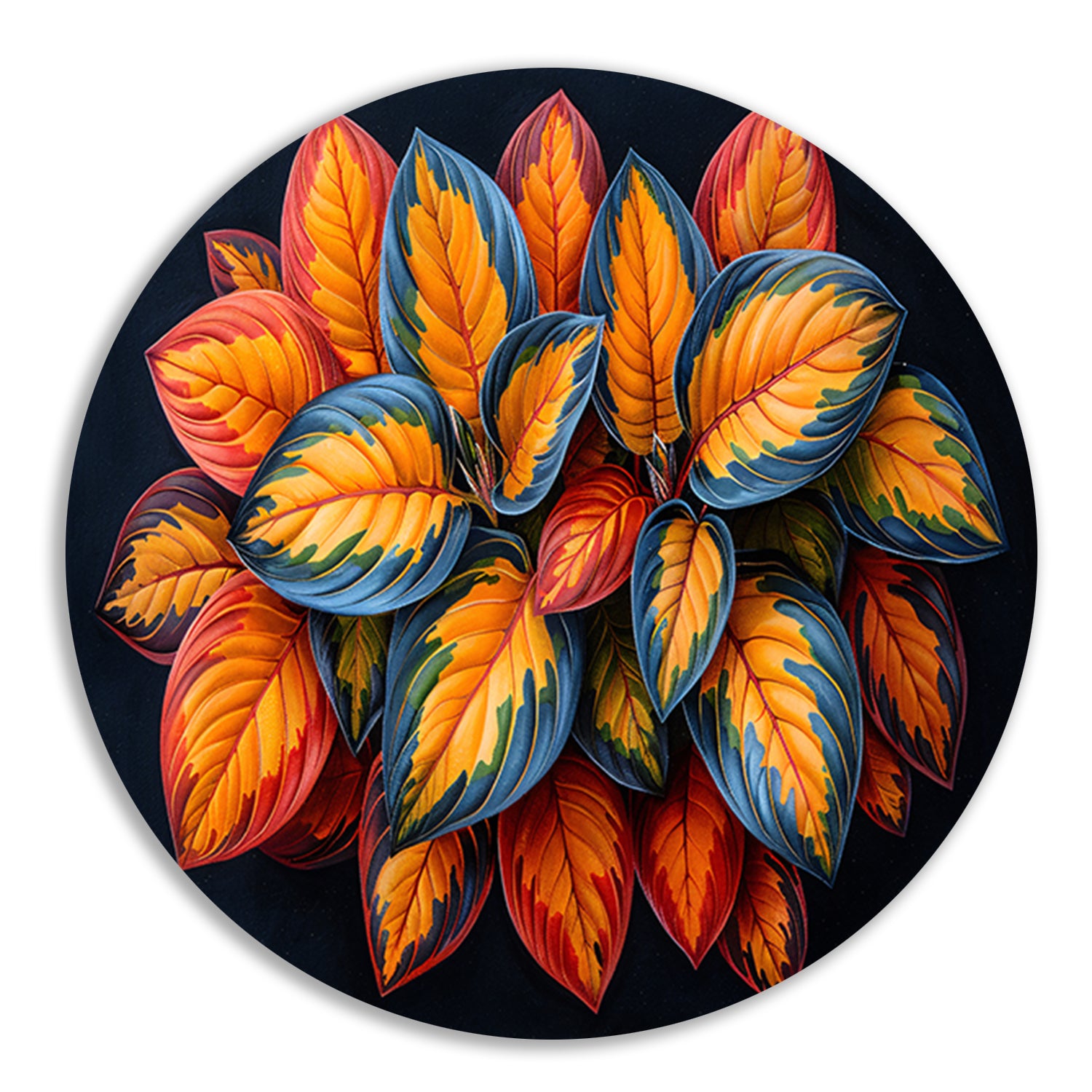 Breng de prachtige kleuren en vormen van de herfst naar binnen met deze Gestileerde Herfstbladeren op Donkere Achtergrond aluminium muurcirkel. Een eyecatcher in elk interieur!