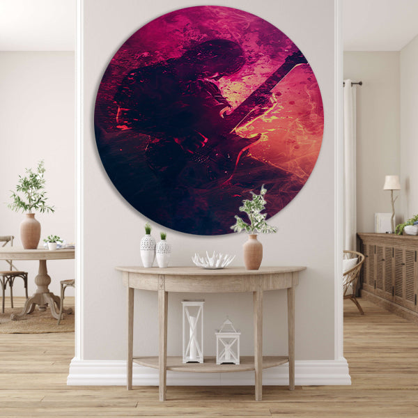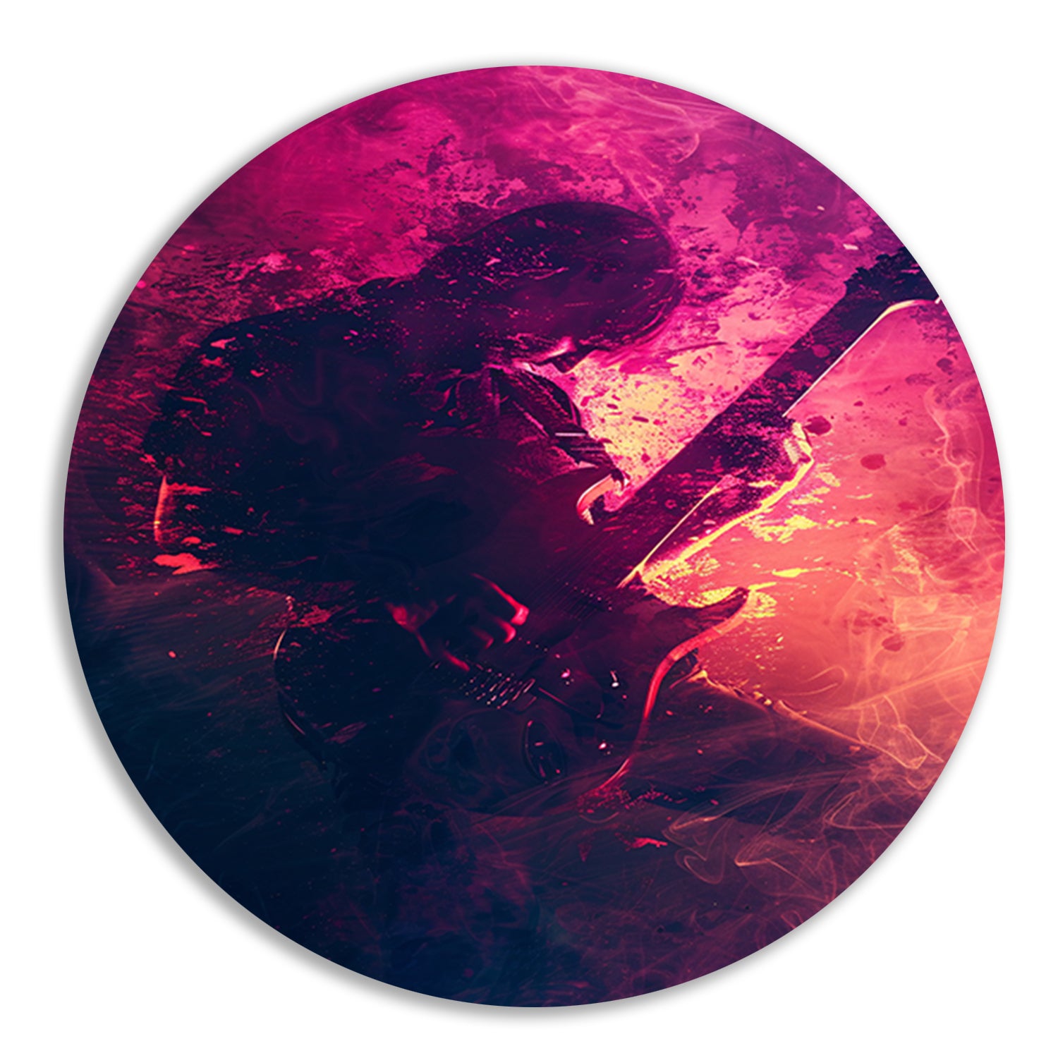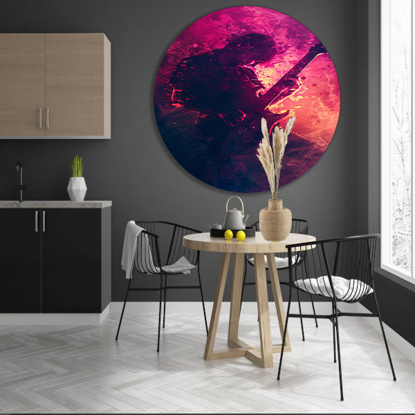 Voeg een artistiek en modern tintje toe aan je ruimte met deze prachtige muurcirkel van de gitarist omhuld door abstract kleurrijk rook. Ideale keuze voor liefhebbers van muziek en kunst!