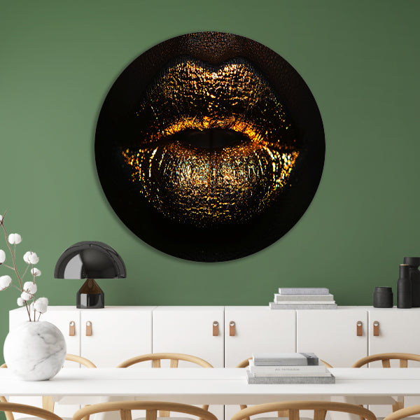 Glanzende gouden en zwarte lippen close-up aluminium muurcirkel