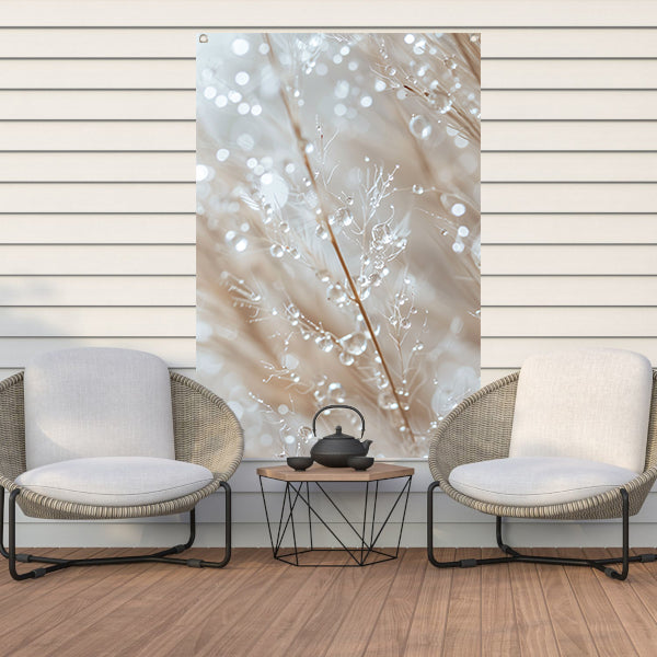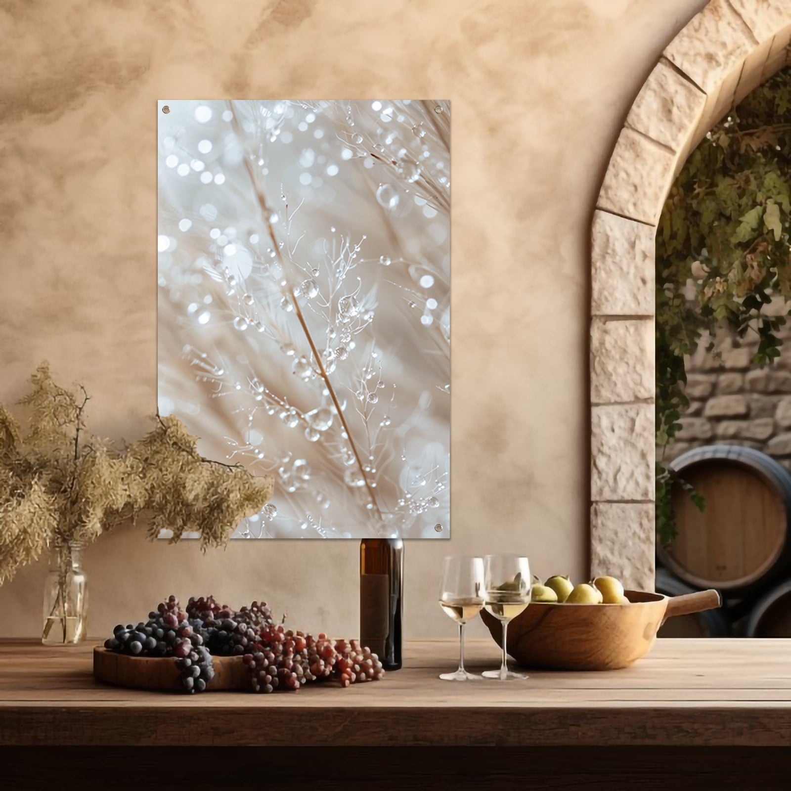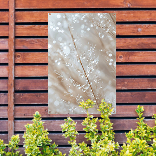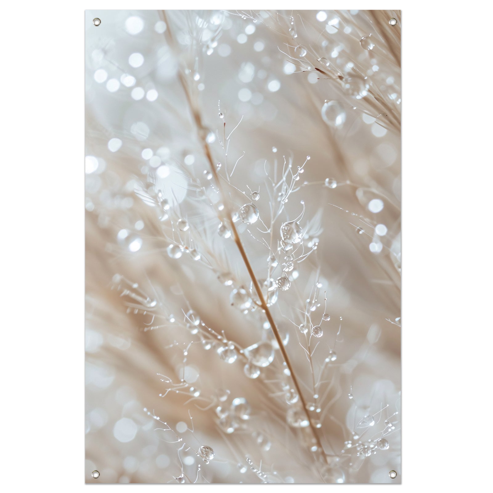 Glinsterende dauwdruppels op grashalmen tuinposter