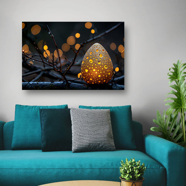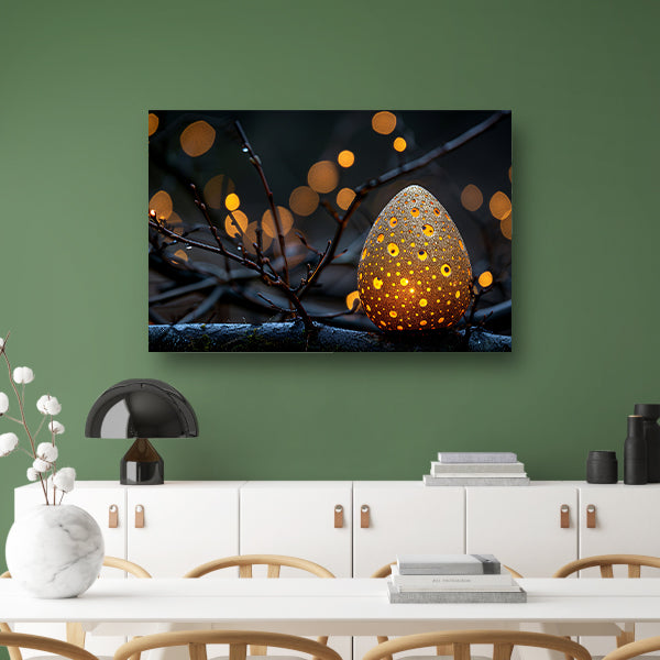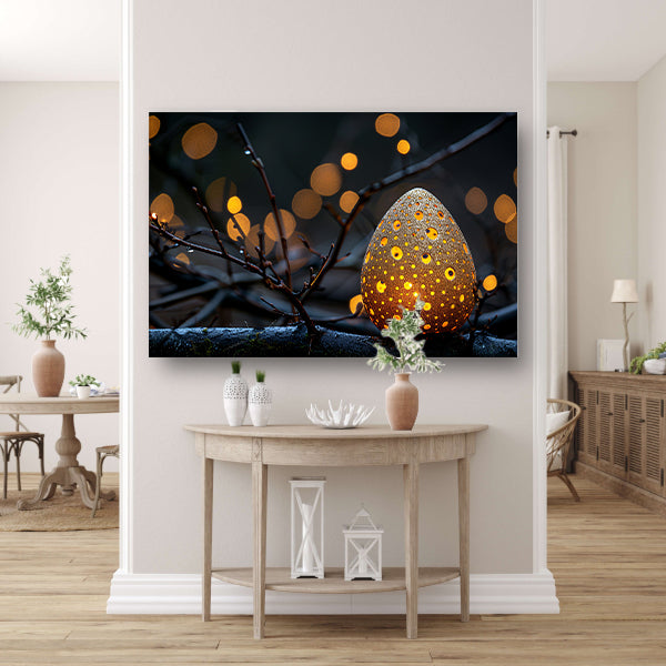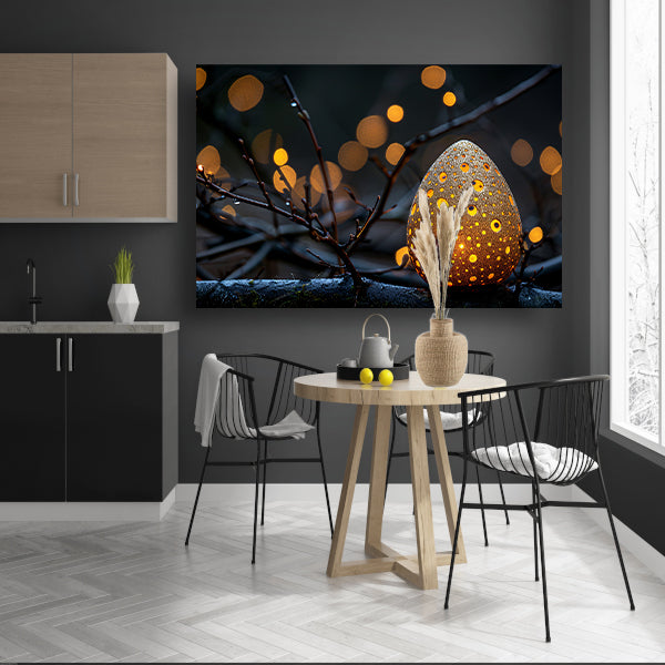 Dit kunstwerk is verkrijgbaar in meerdere formaten, zodat u de perfecte maat kunt kiezen voor uw ruimte. Of u nu op zoek bent naar een statement piece voor in de woonkamer of een subtiele toevoeging aan de slaapkamer, het Goud Ei op Tak kunstwerk past in elke kamer.