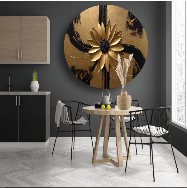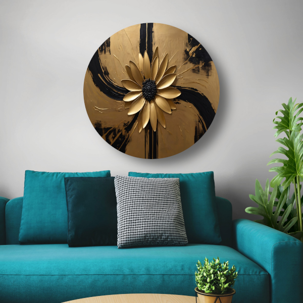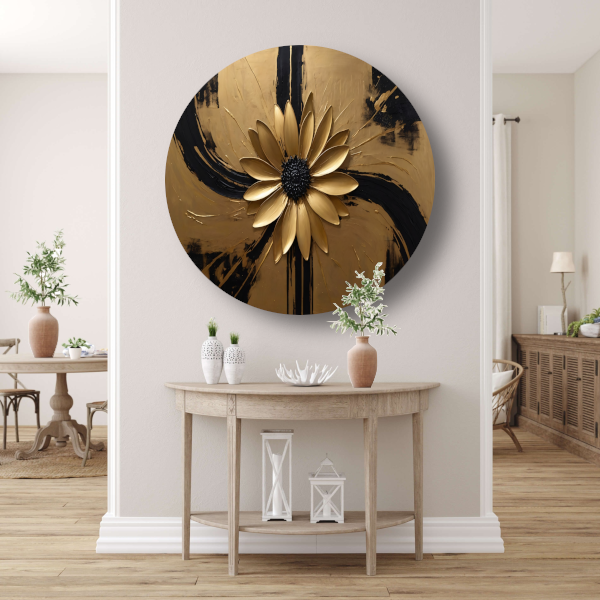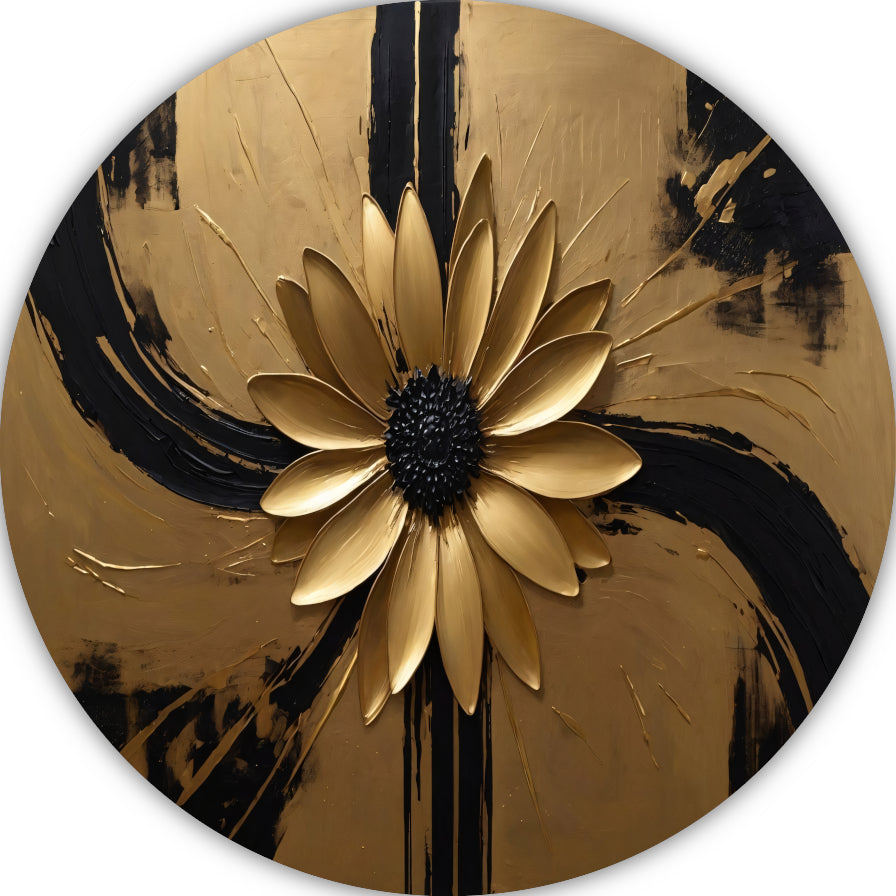 Gouden Bloem Abstract op Zwart Canvas aluminium muurcirkel