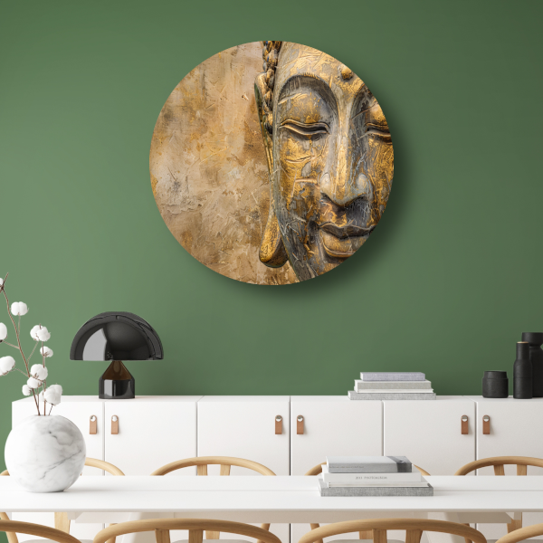 Gouden Boeddha portret op verweerde achtergrond aluminium muurcirkel