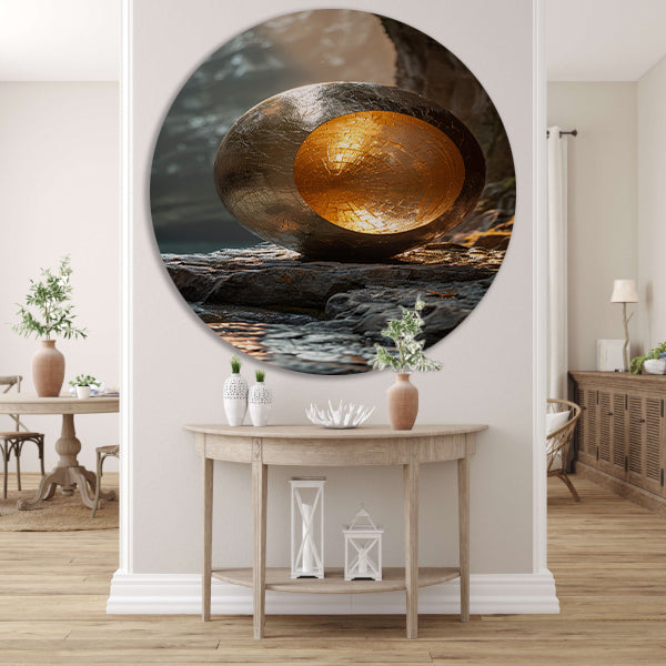 Gouden bolvormige sculptuur in grot aluminium muurcirkel