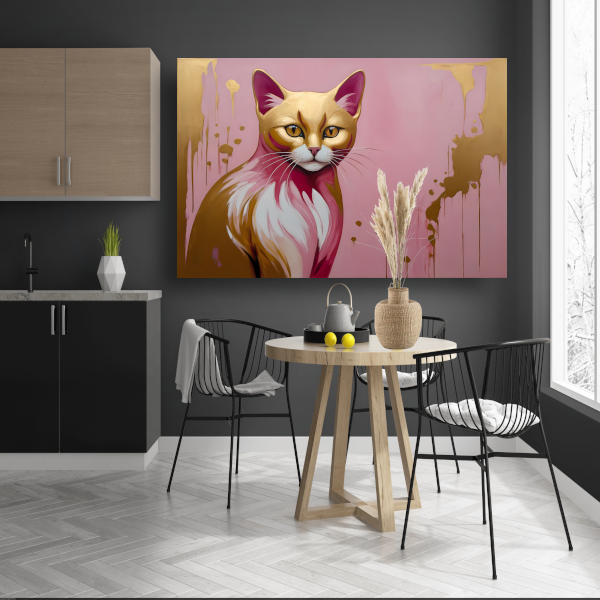 Dit katportret is verkrijgbaar in meerdere maten, waardoor je altijd de perfecte afmeting kunt kiezen voor jouw ruimte. Of je nu een liefhebber bent van katten of gewoon op zoek bent naar een uniek en trendy kunstwerk, dit gouden en roze moderne katportret op acrylglas is een must-have voor jouw interieur. Voeg het toe aan je winkelwagen en geniet van de schoonheid die het aan je huis zal toevoegen.